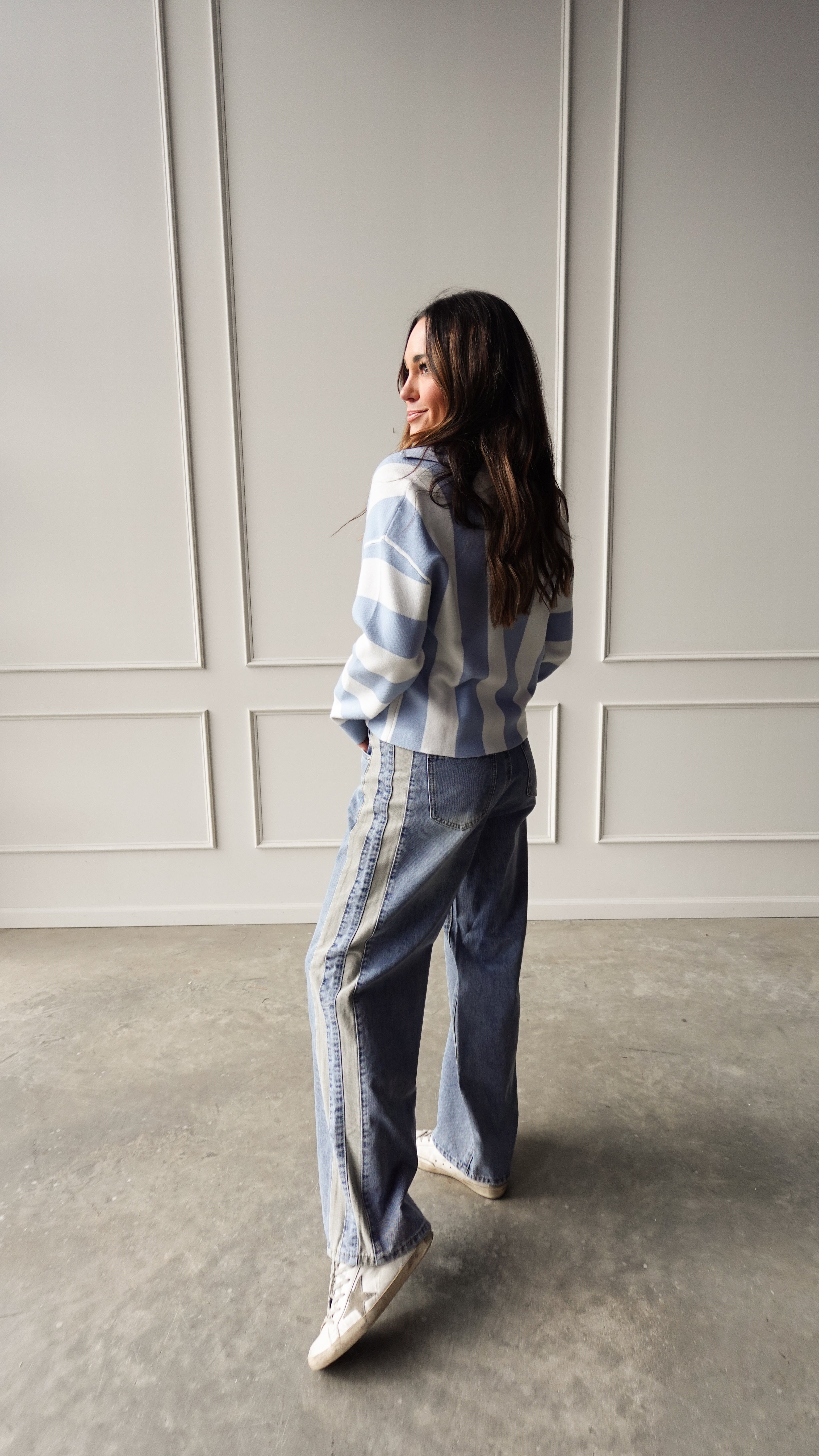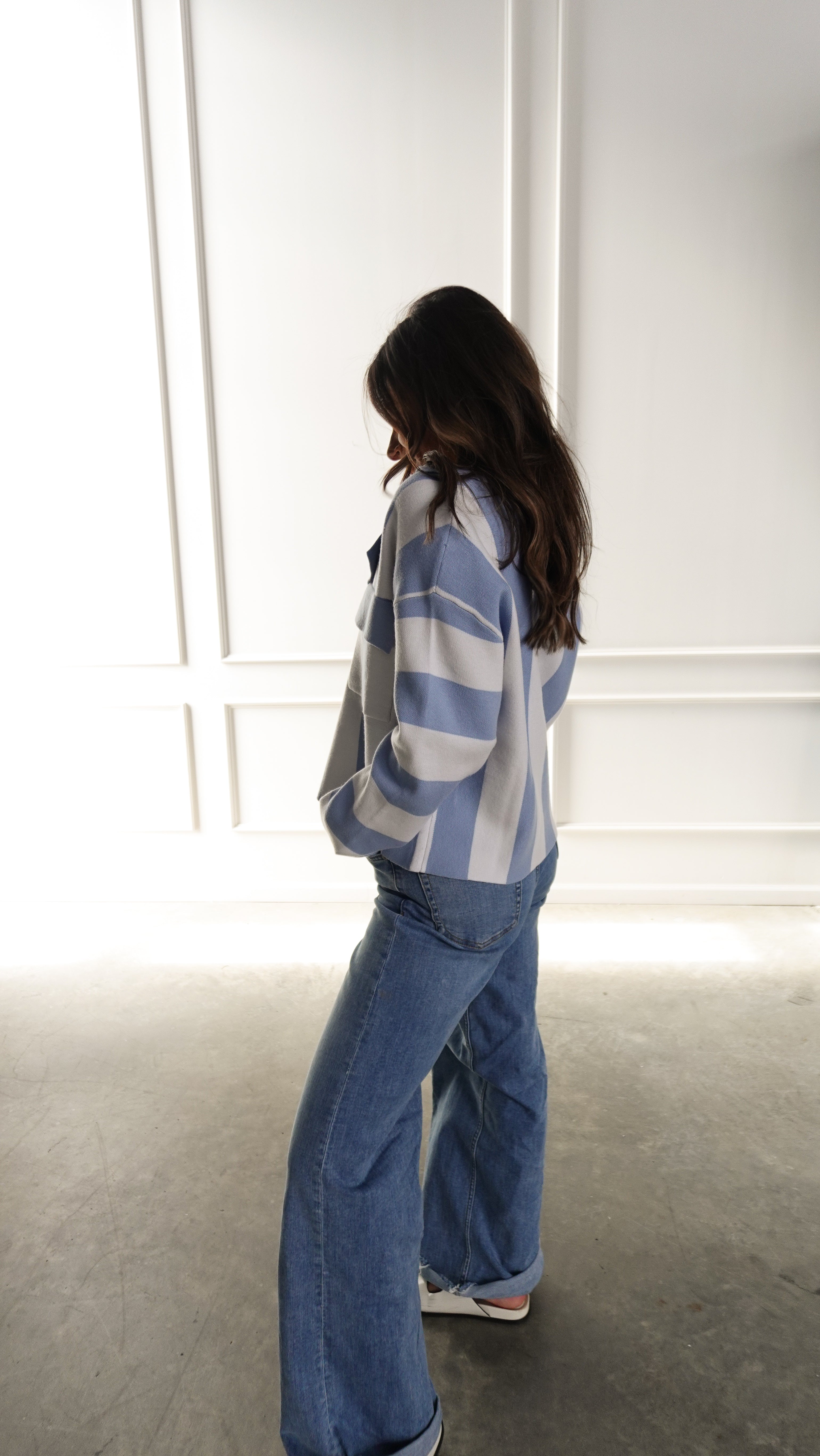 This blue striped cardigan is the perfect mix of cozy and polished—lightweight, relaxed, and quietly elevated.