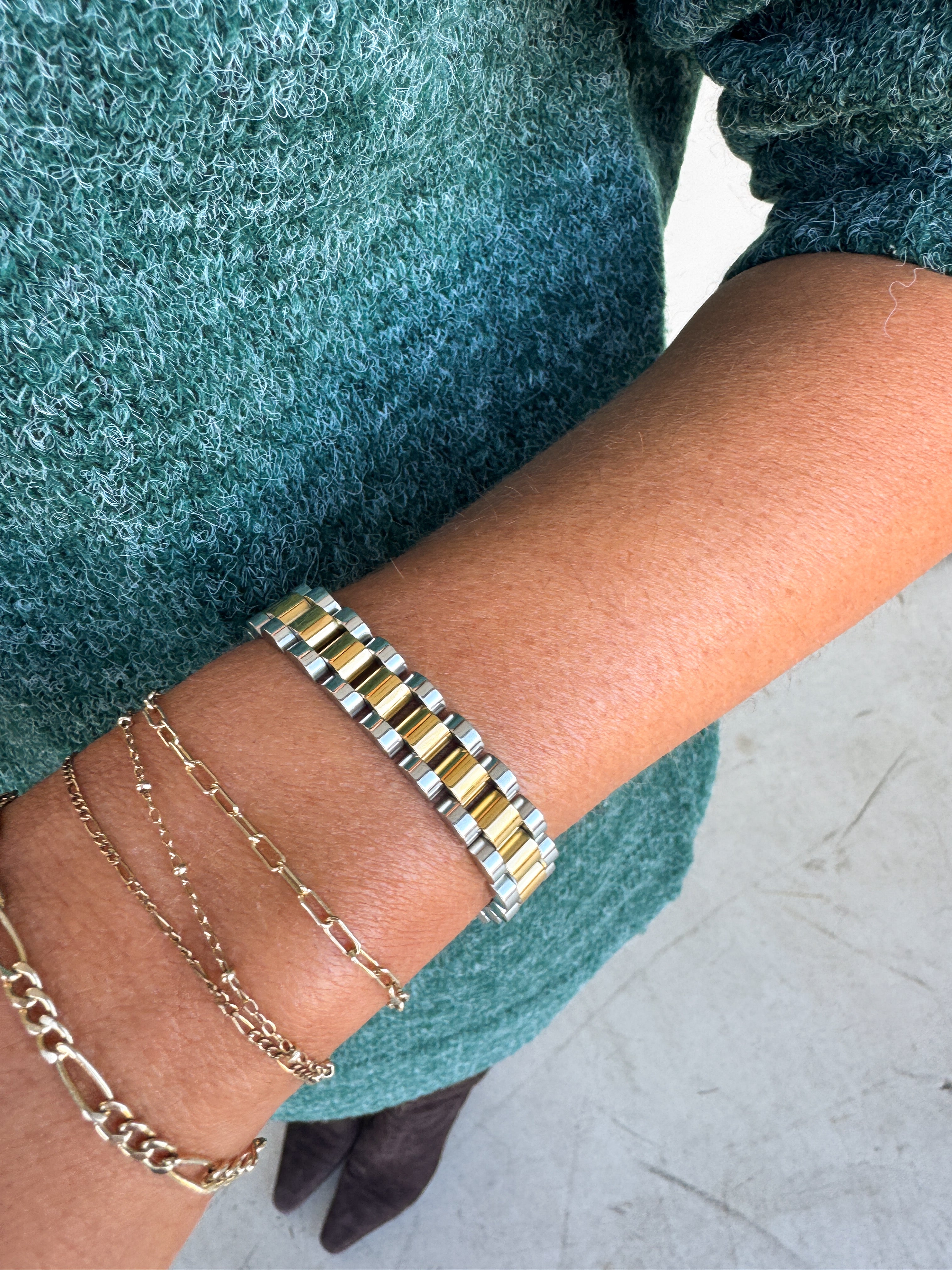 Crafted in a bold, two-tone metal mix of gold and silver, this piece strikes the perfect balance between everyday ease and elevated shine. The classic watch-link design gives a hint of timeless sophistication, while the modern contrast makes it easy to stack with your favorite chains or wear solo for a sleek statement.