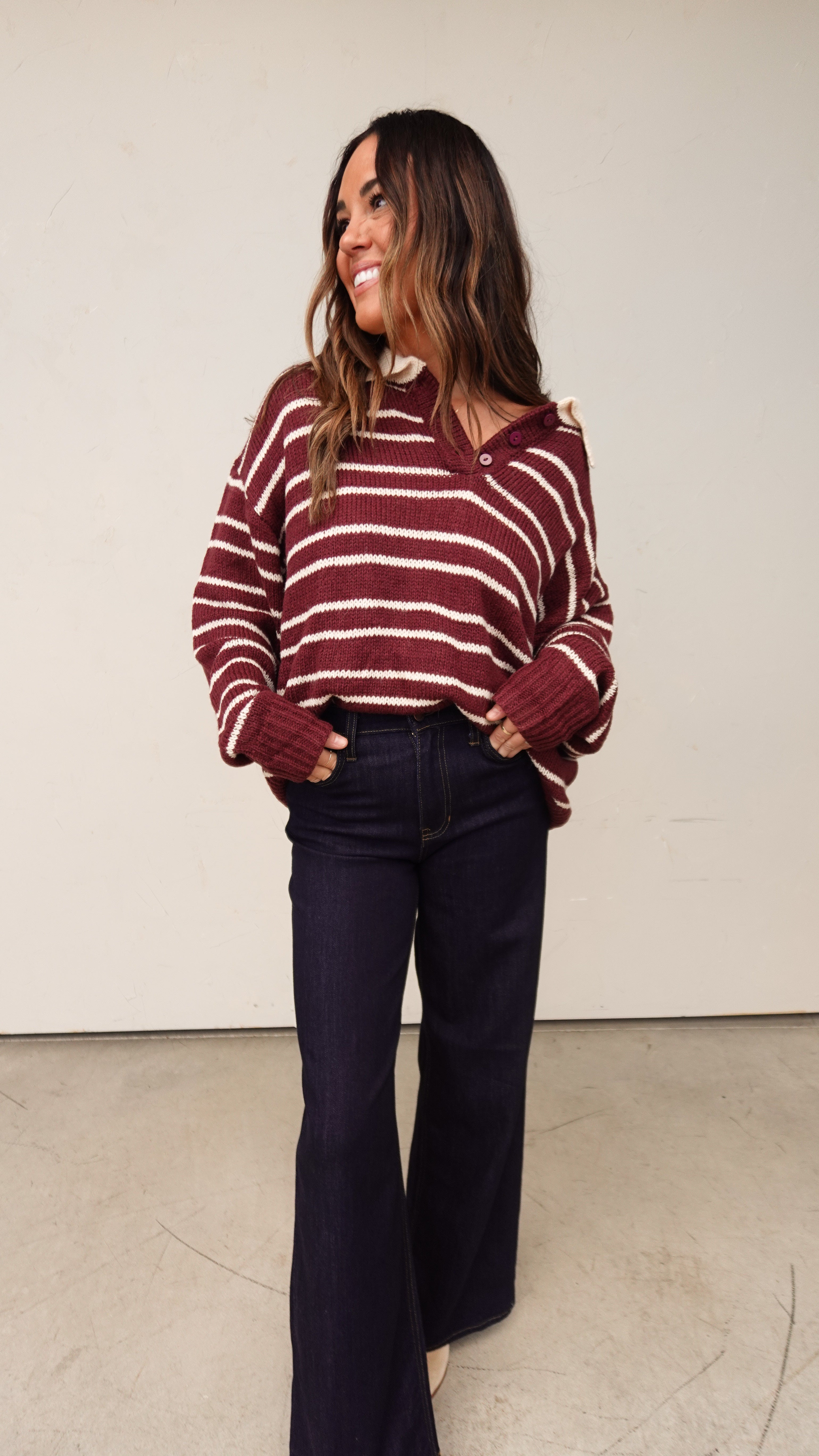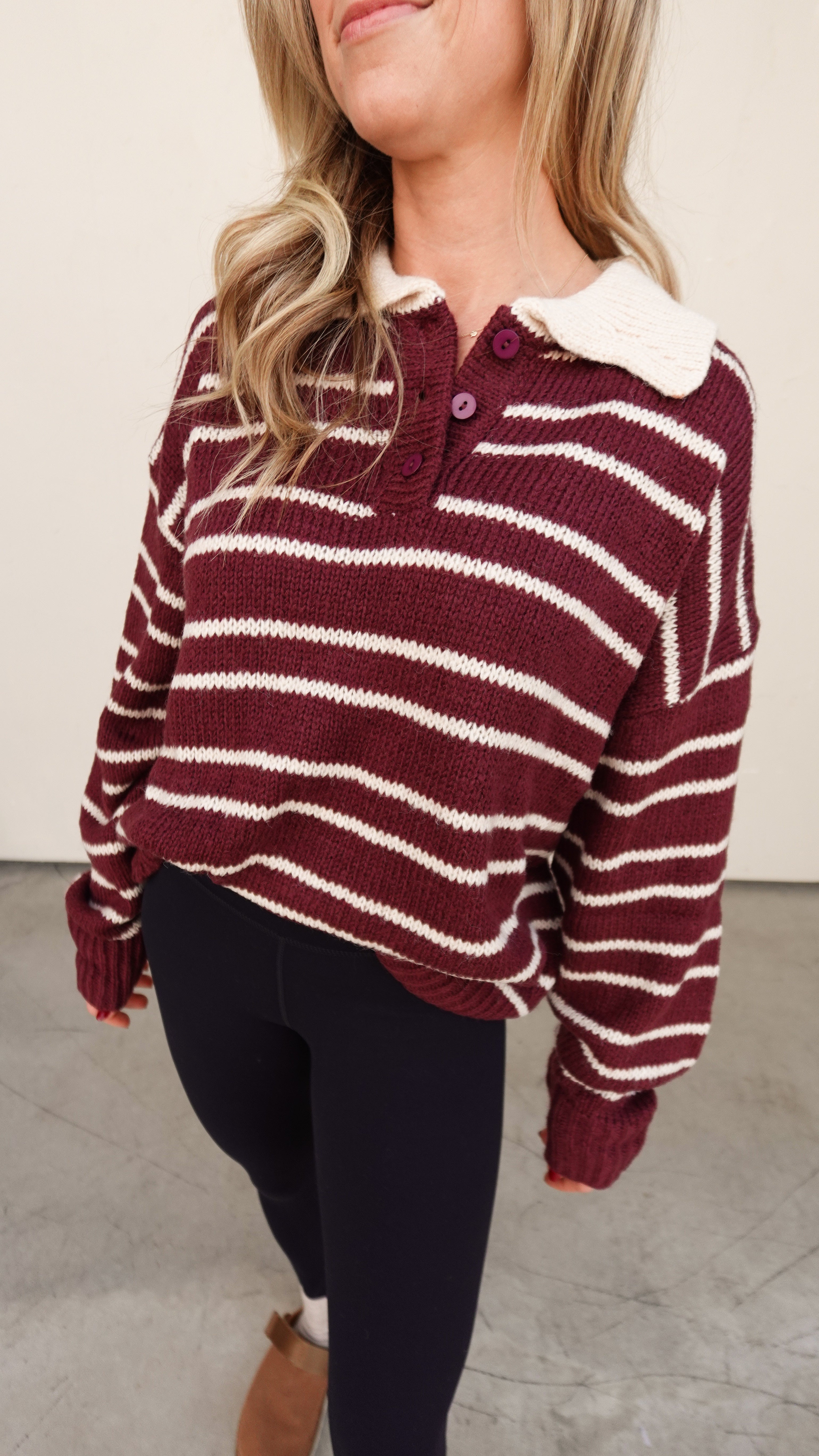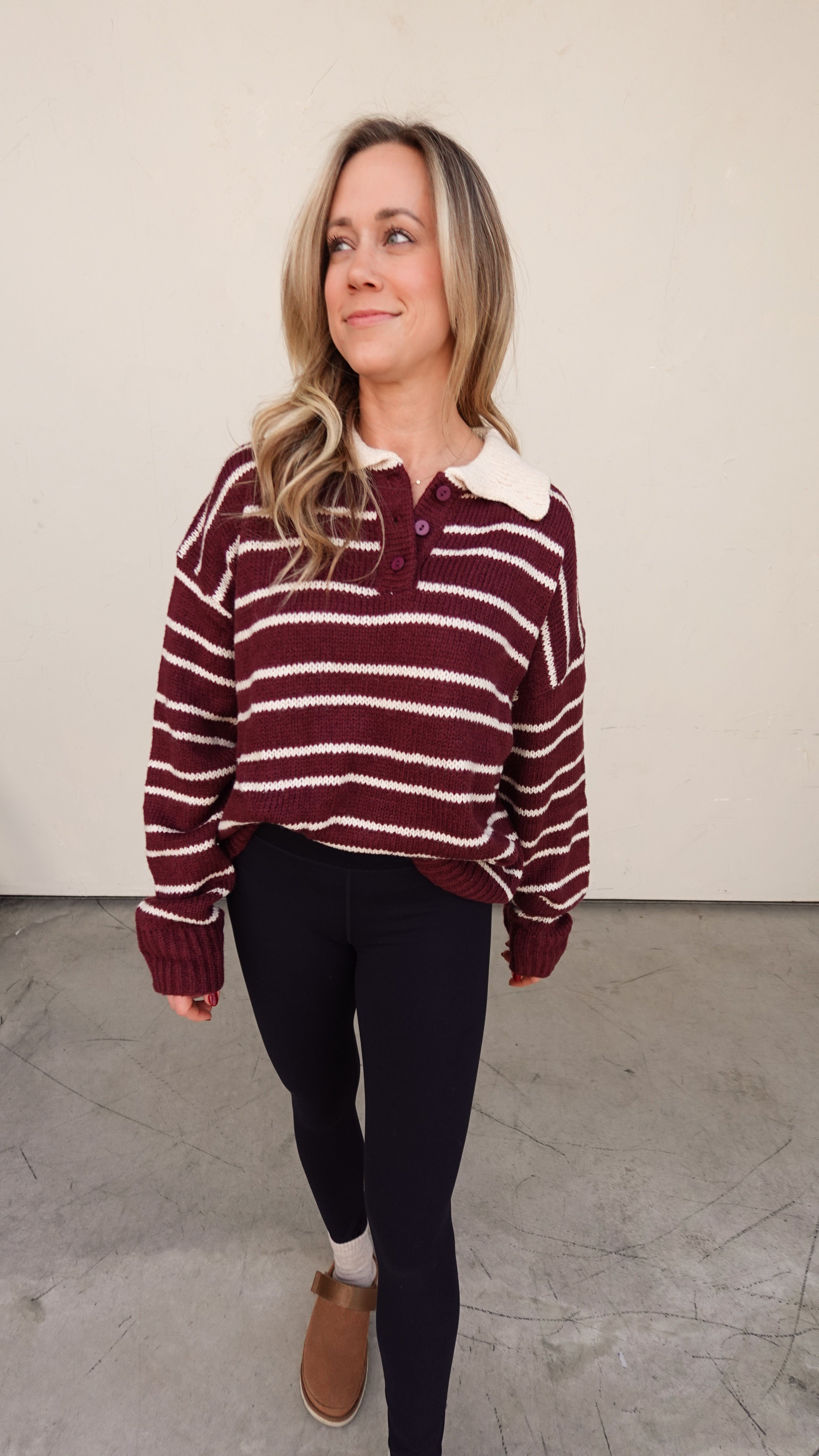 Cozy knit with bold horizontal stripes in burgundy and cream