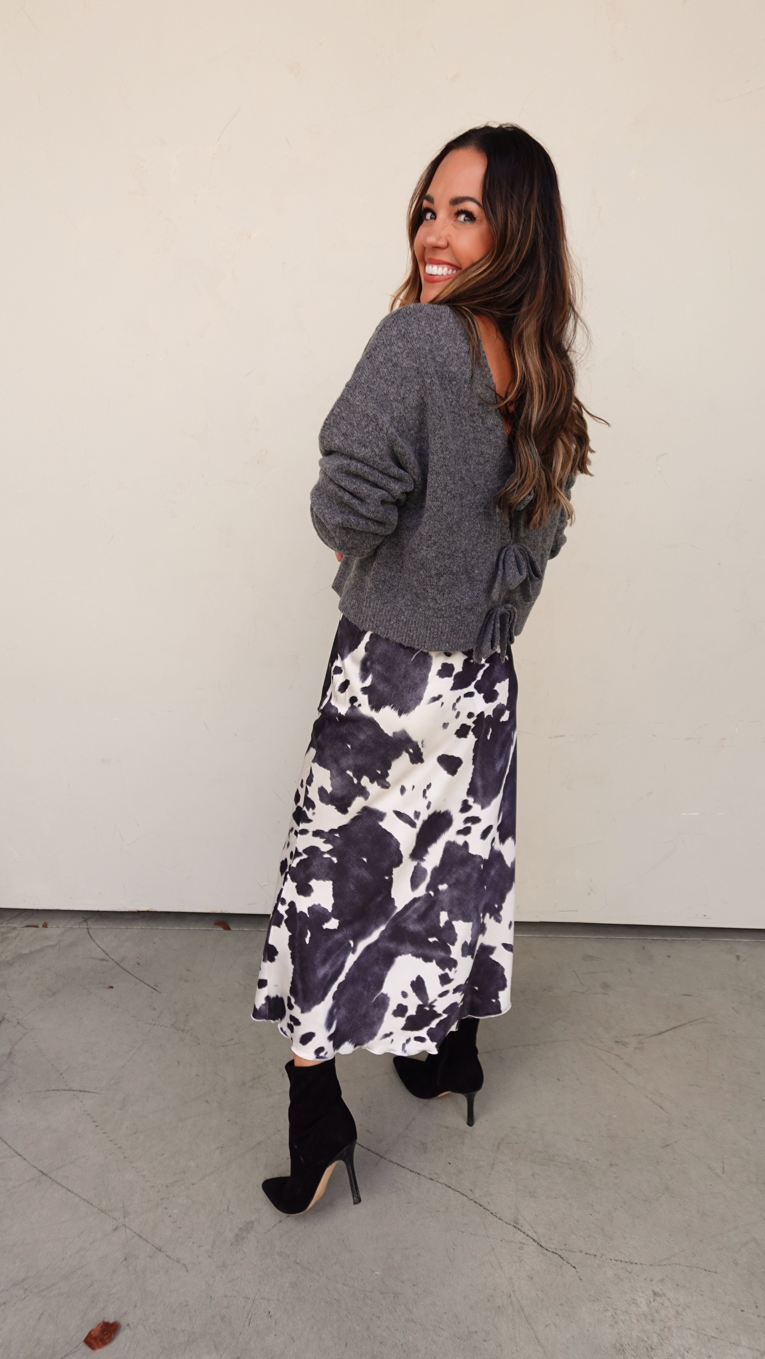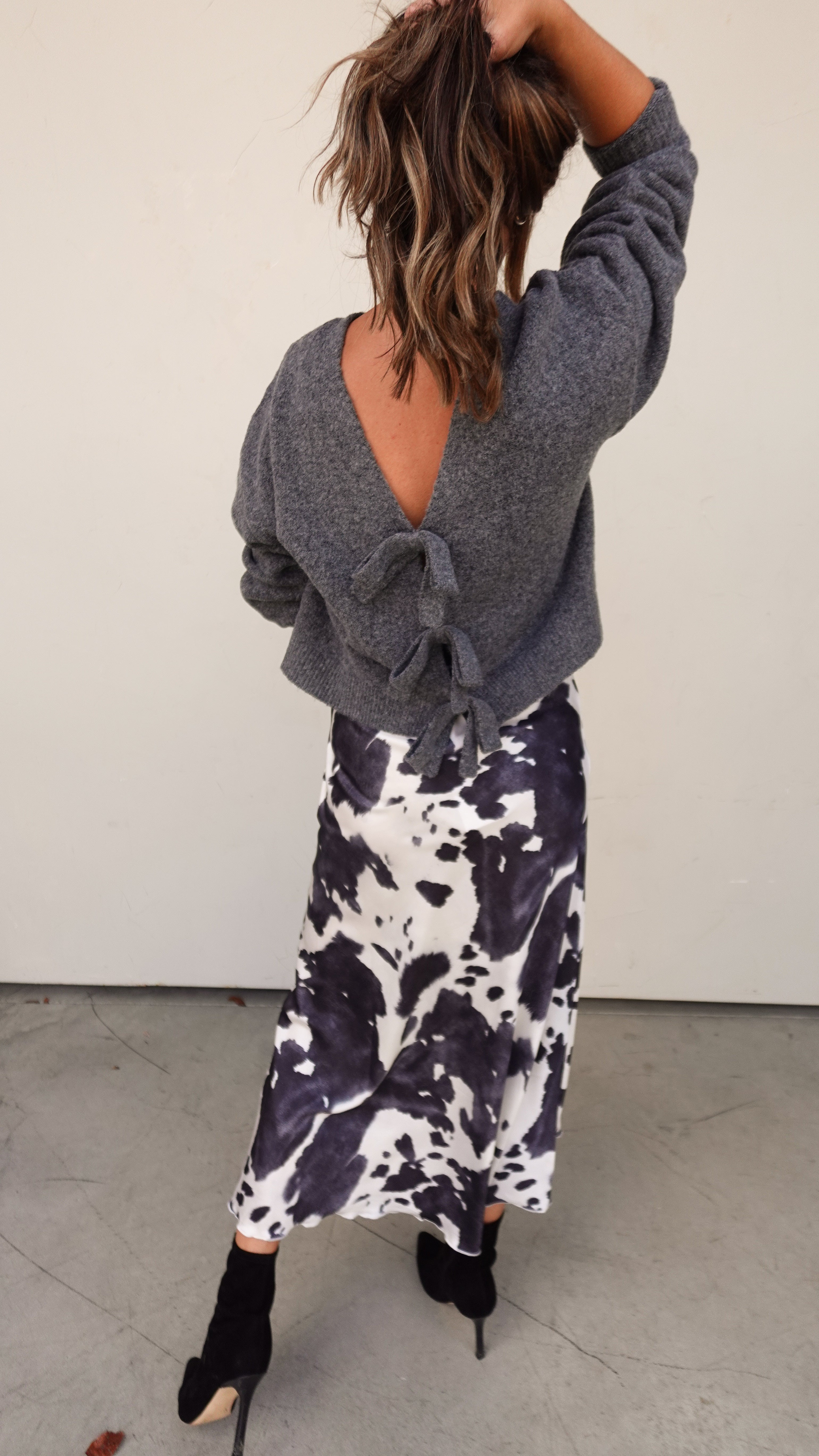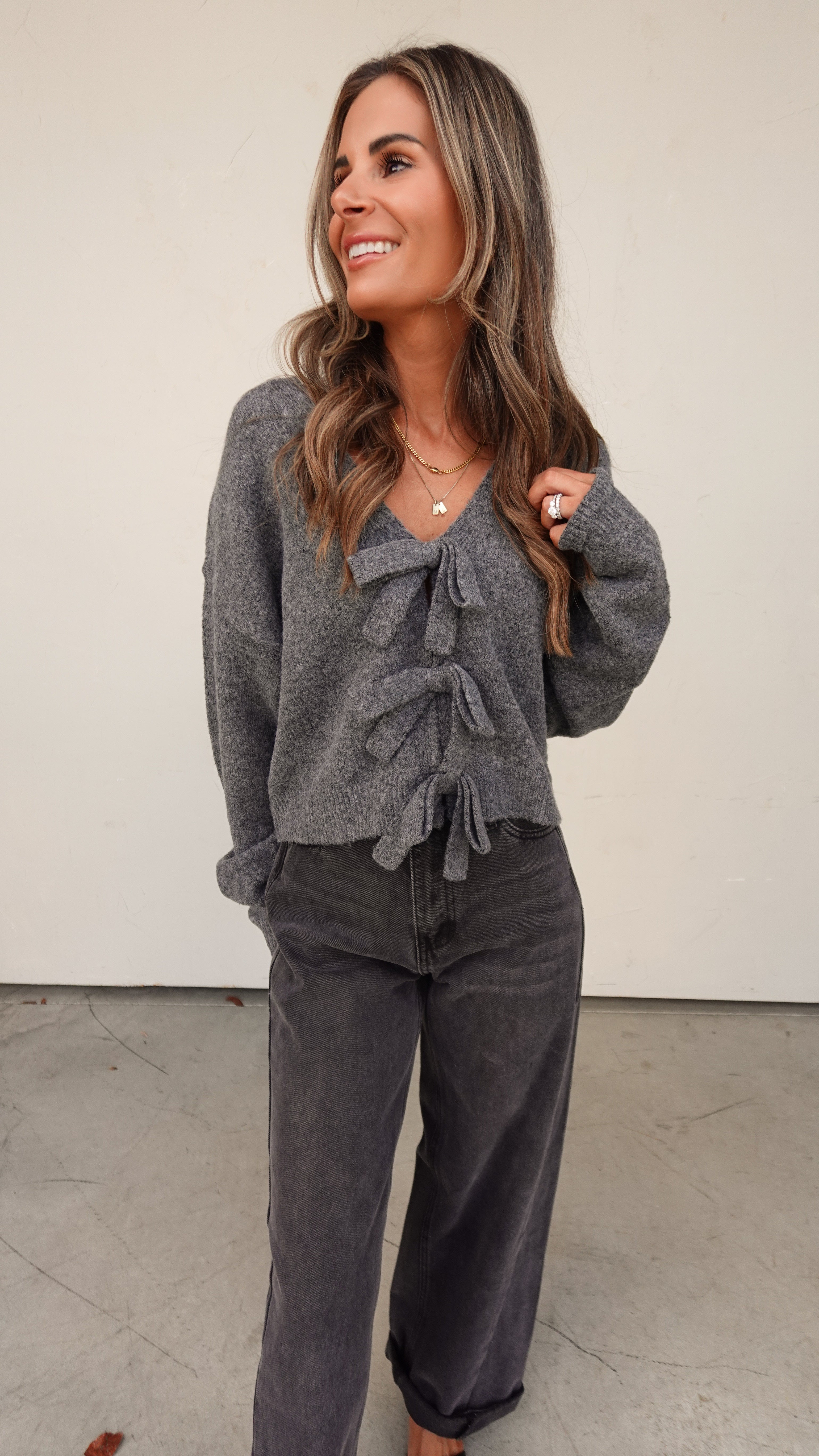 Soft charcoal knit with playful bow-tie accents down the back (or front—wear it both ways!)