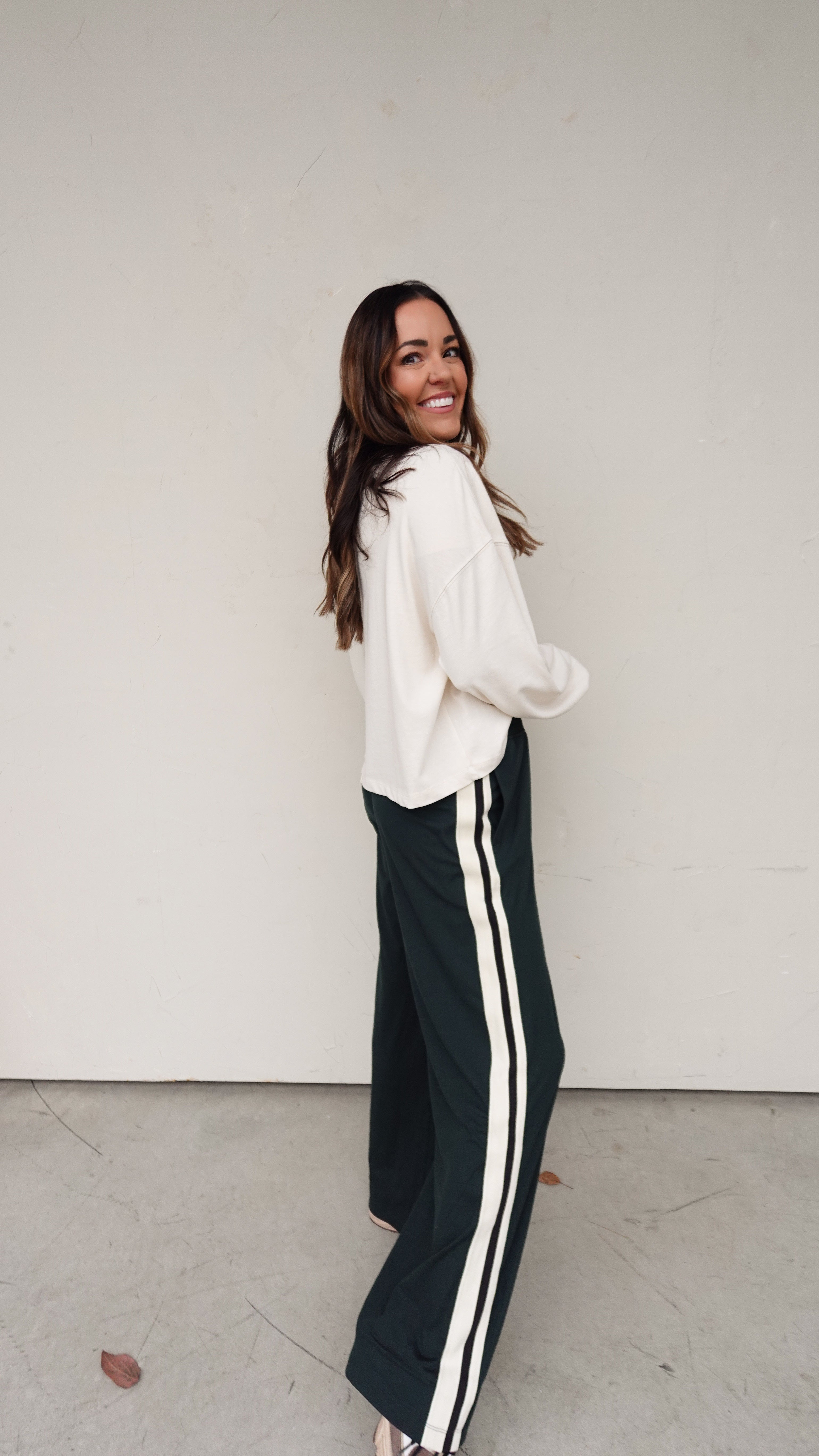 Deep green base with crisp cream side stripes for a clean, elongating line down the leg.