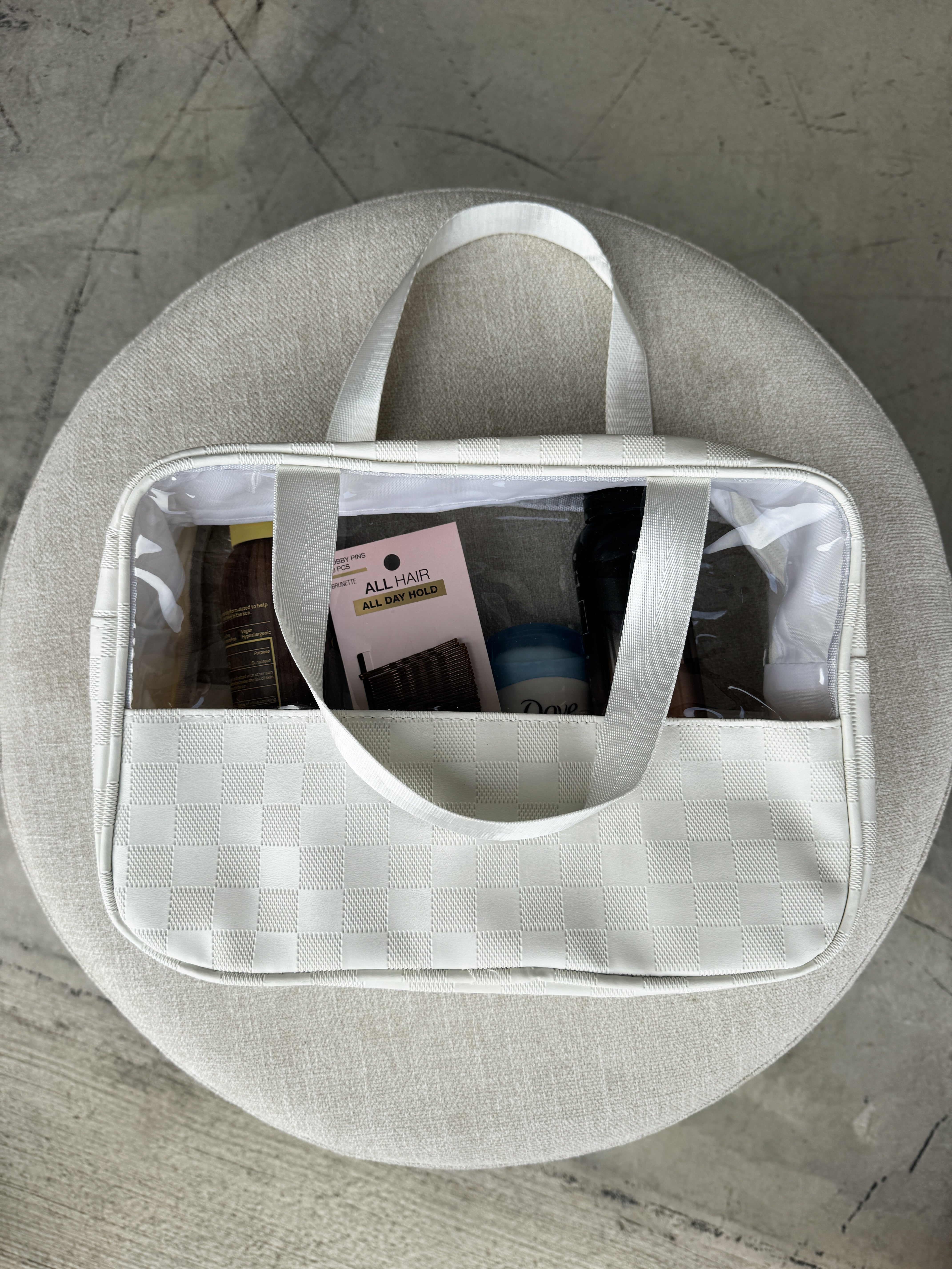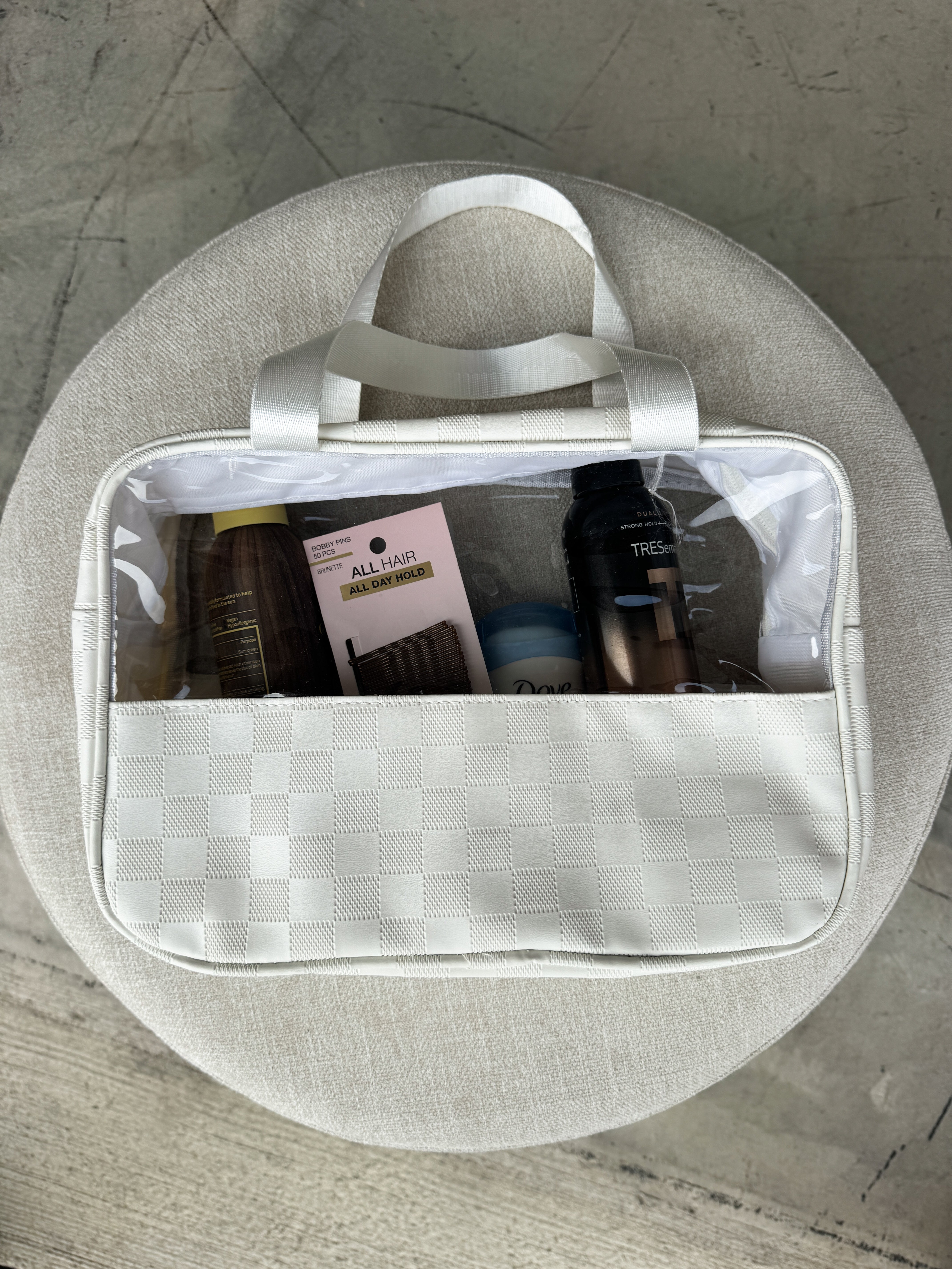 - Wipeable cosmetic bag with zipper closure and subtle checkered design