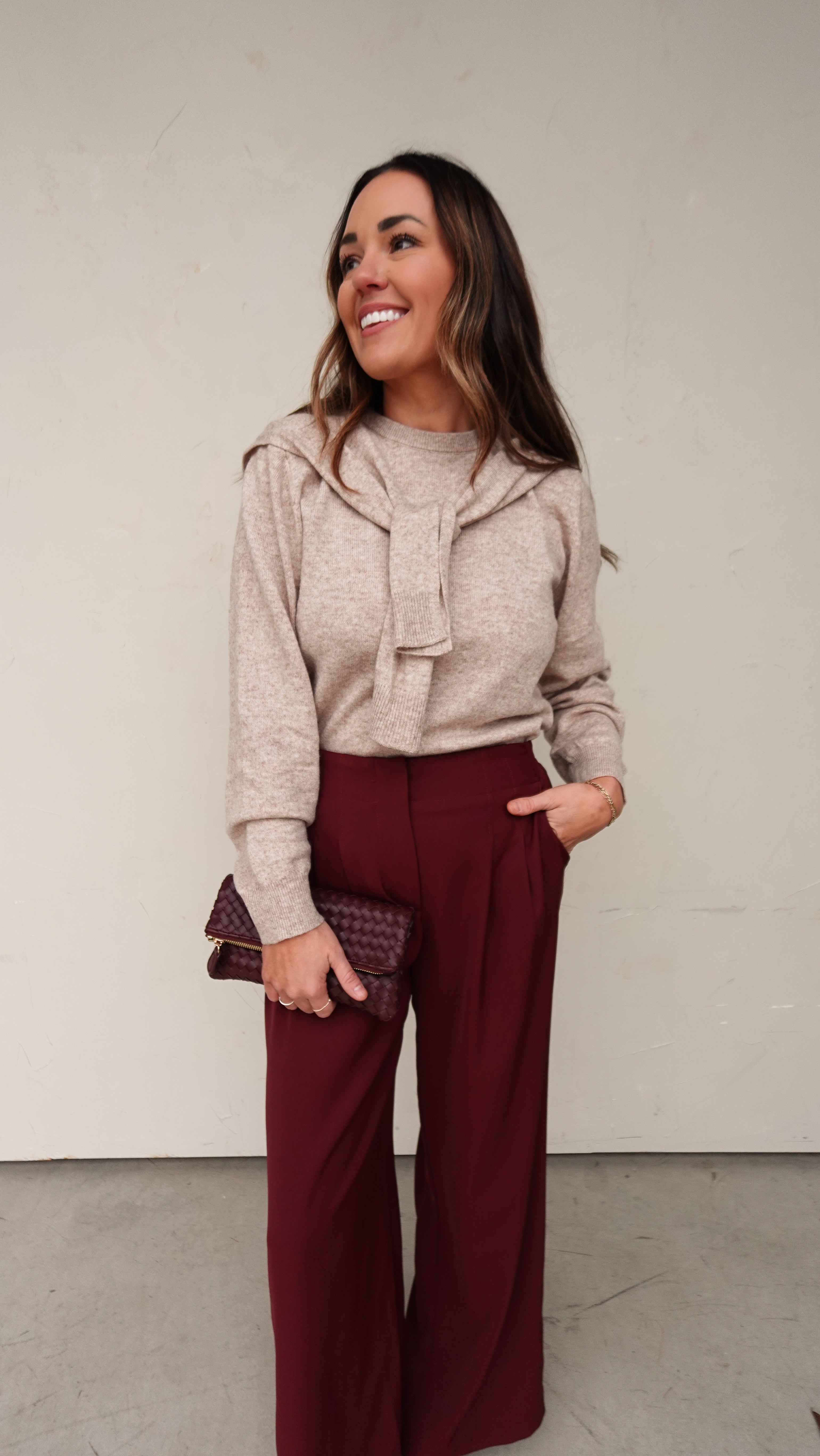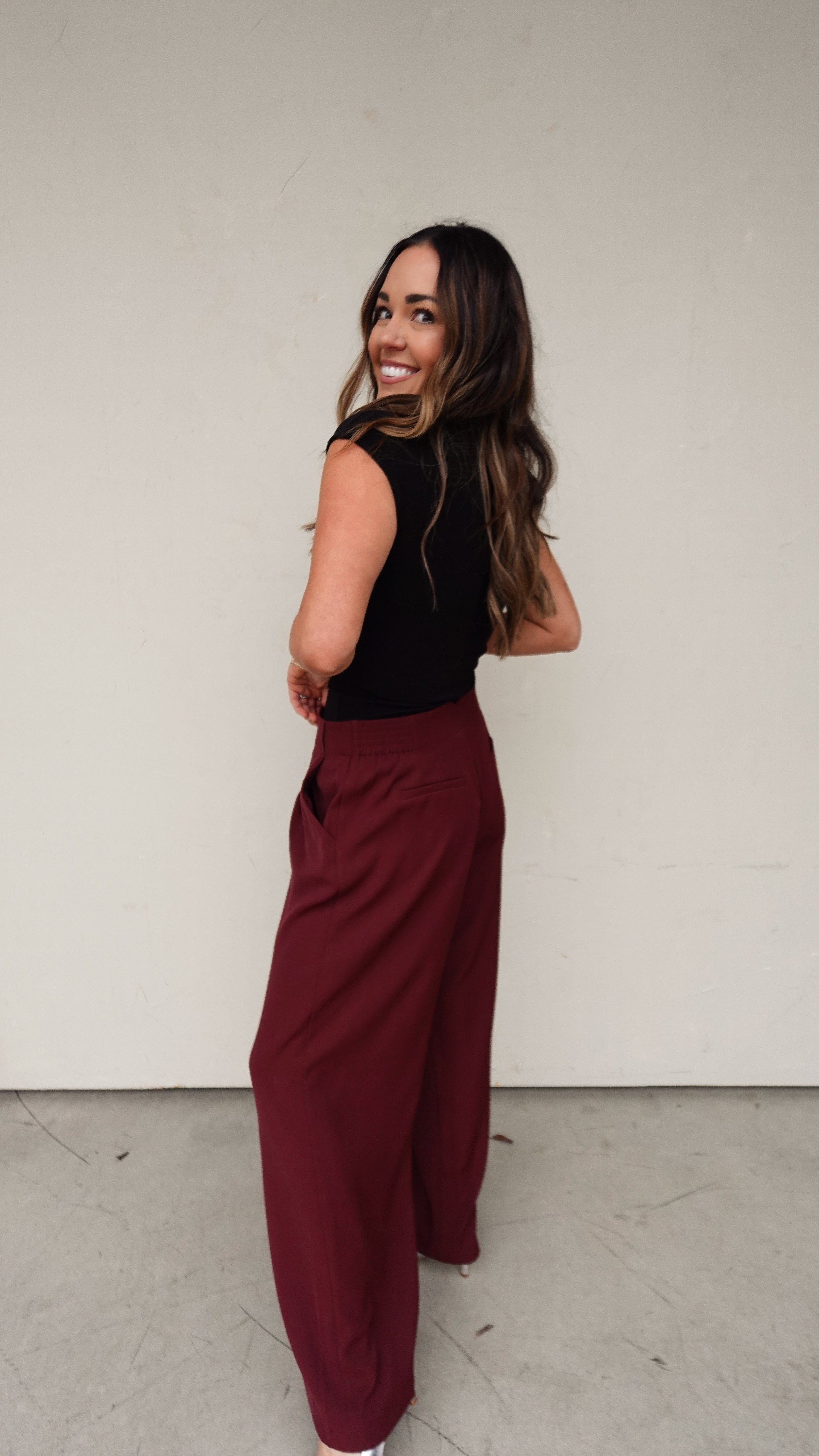 Elevated wide-leg trousers in a rich wine/burgundy tone—polished, timeless, and quietly powerful.