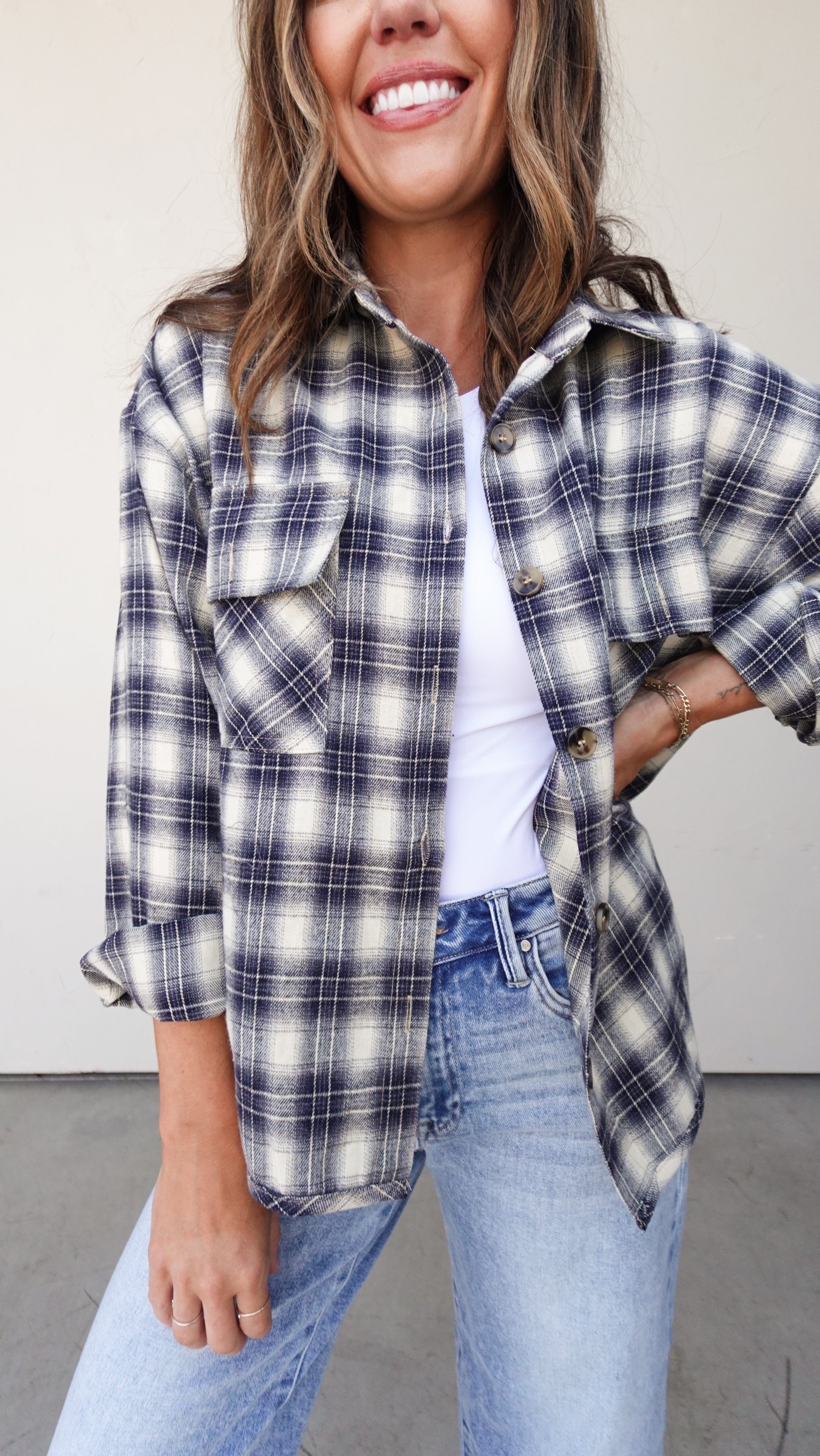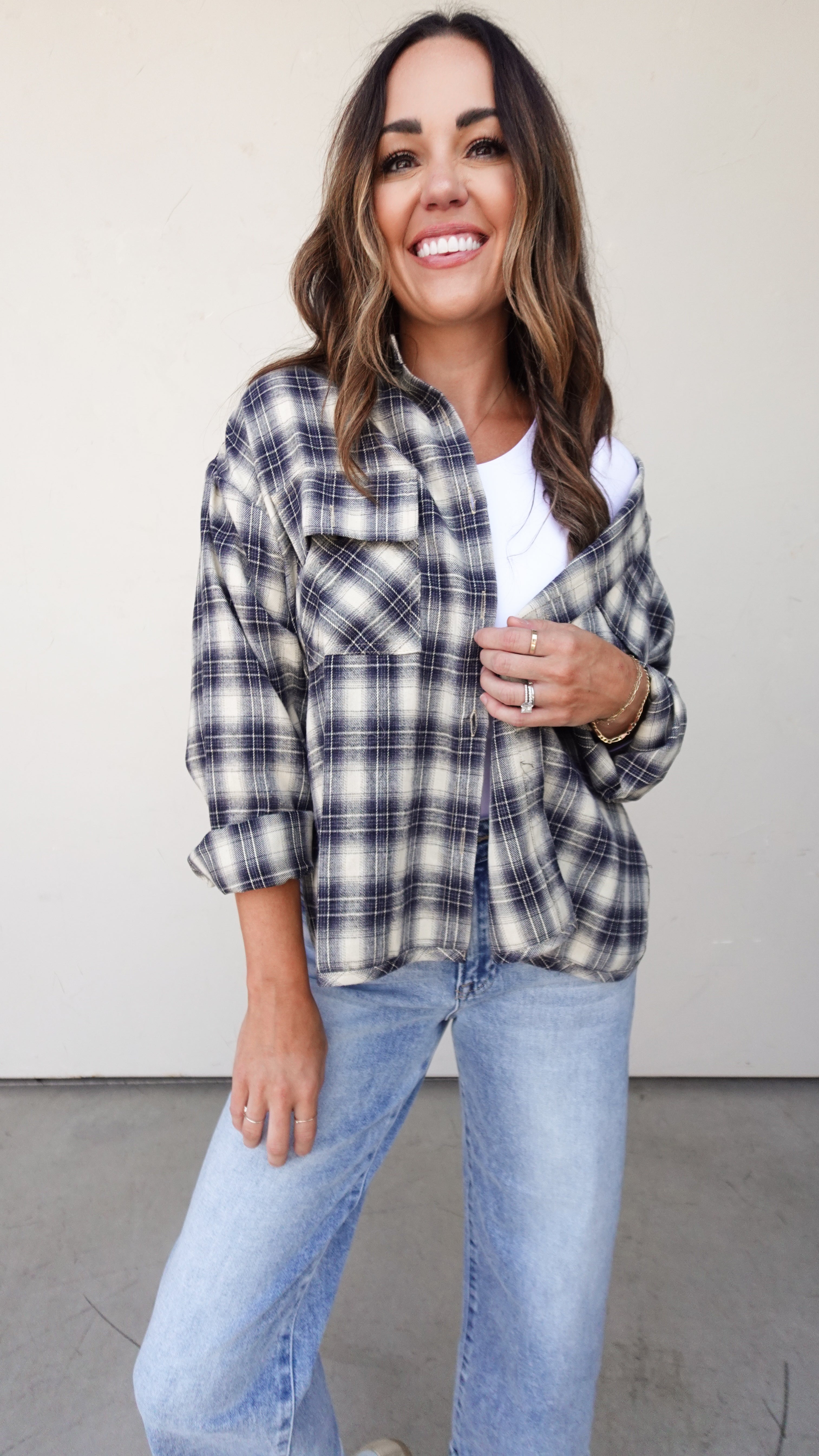 Style tip: Tie around the waist for a laid-back layer, or button and tuck for a crisp finish.