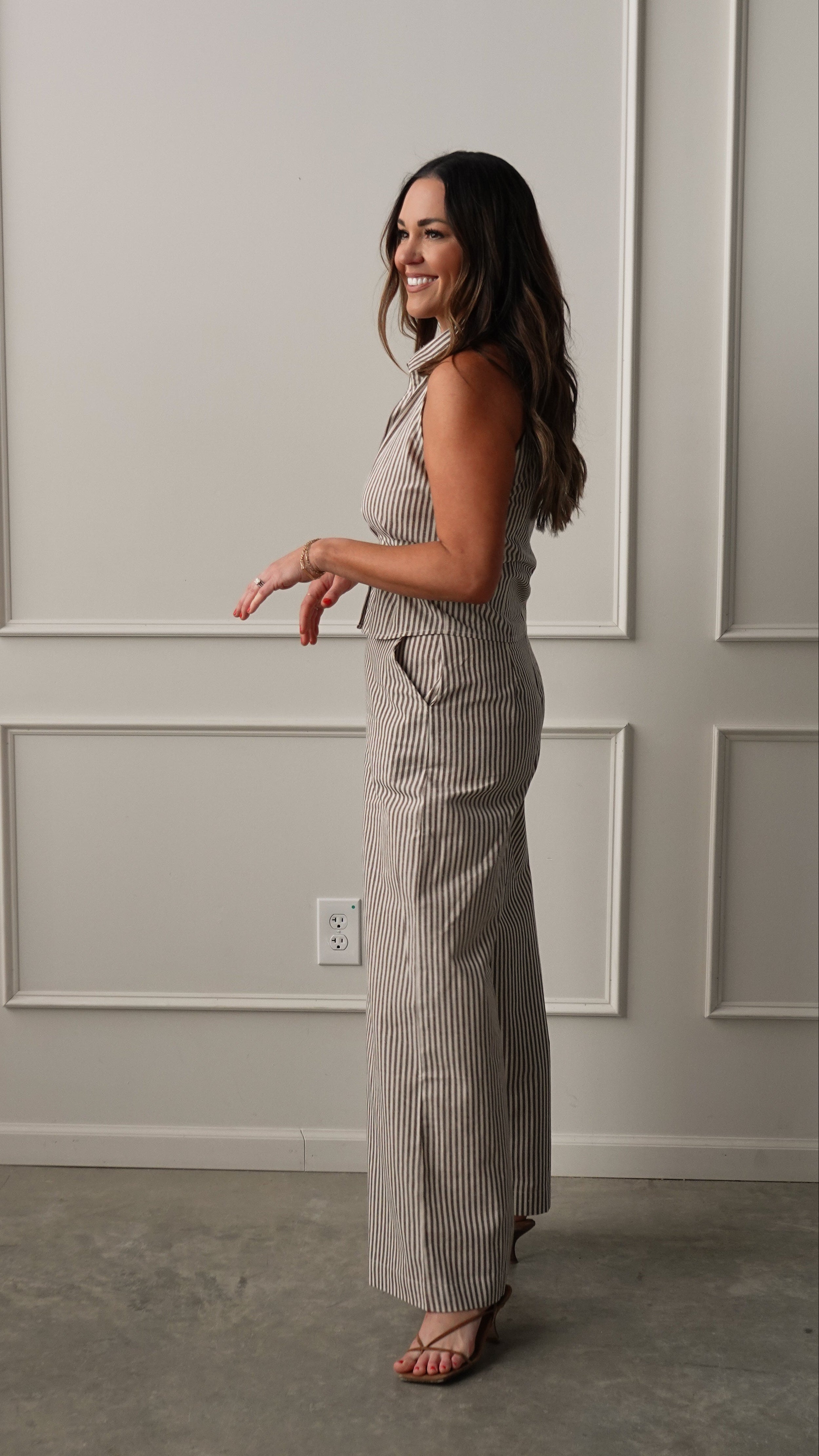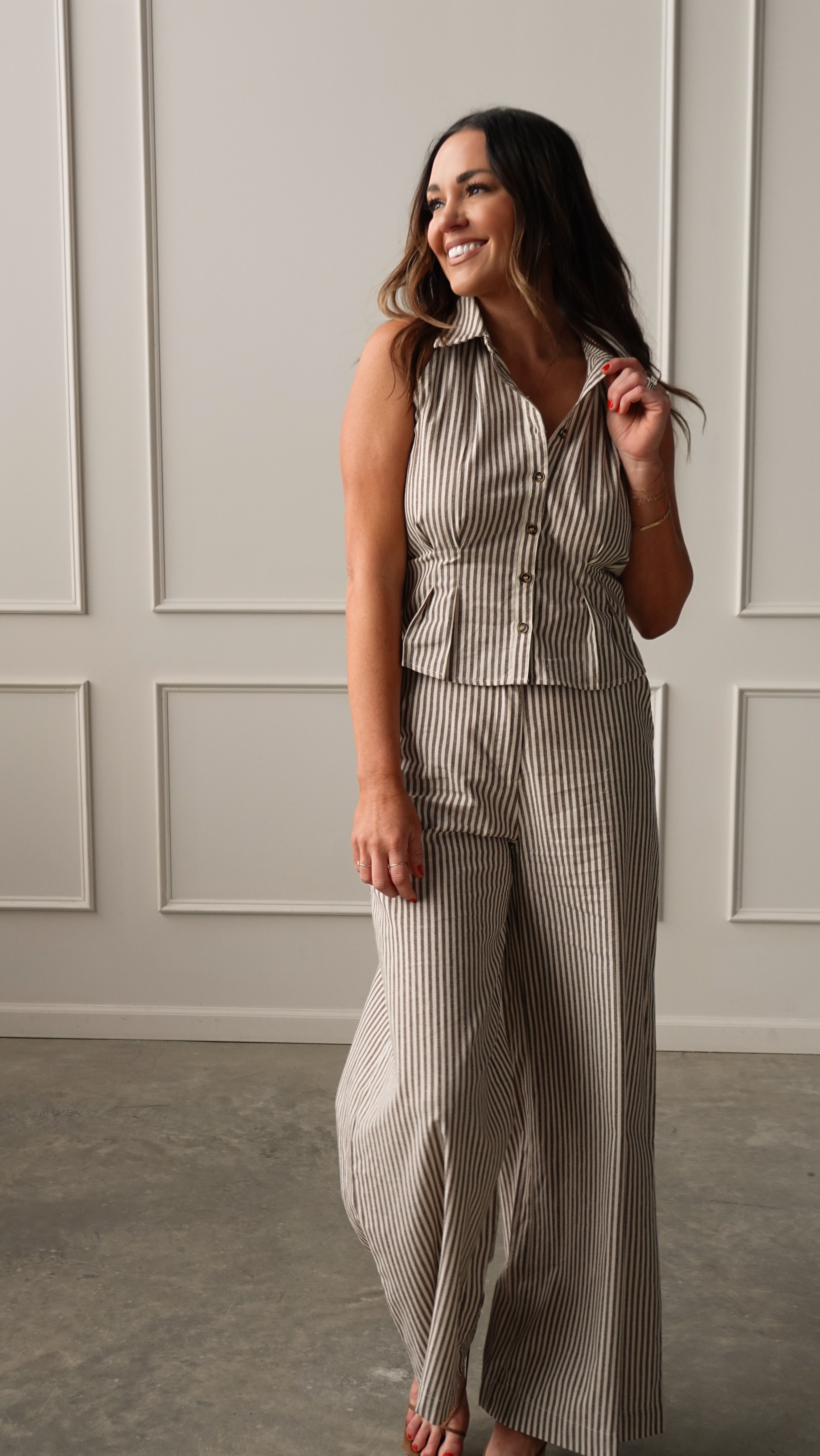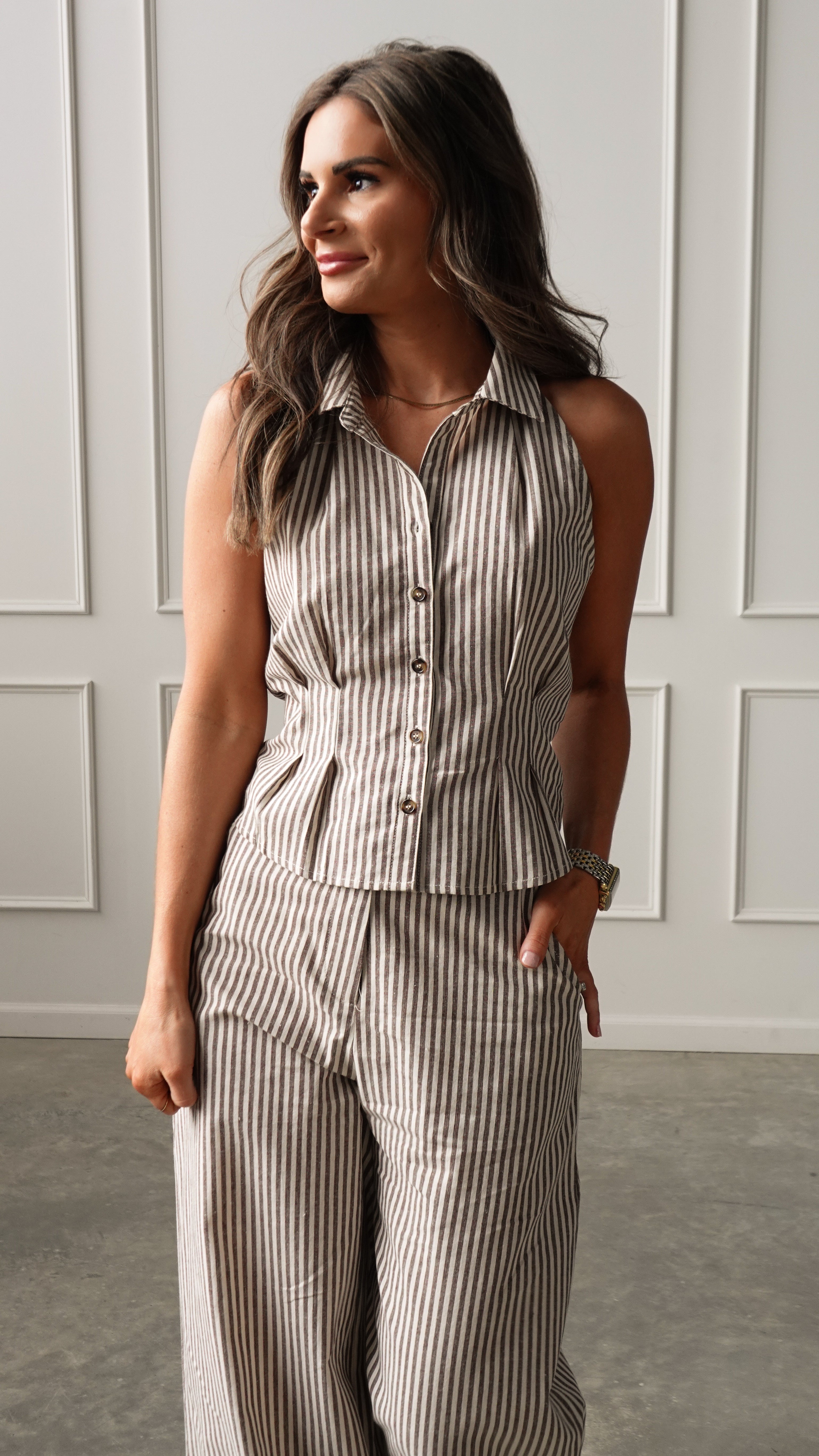A tailored sleeveless button-down in the most timeless stripe. The ideal piece to transition from workwear to dinner plans!