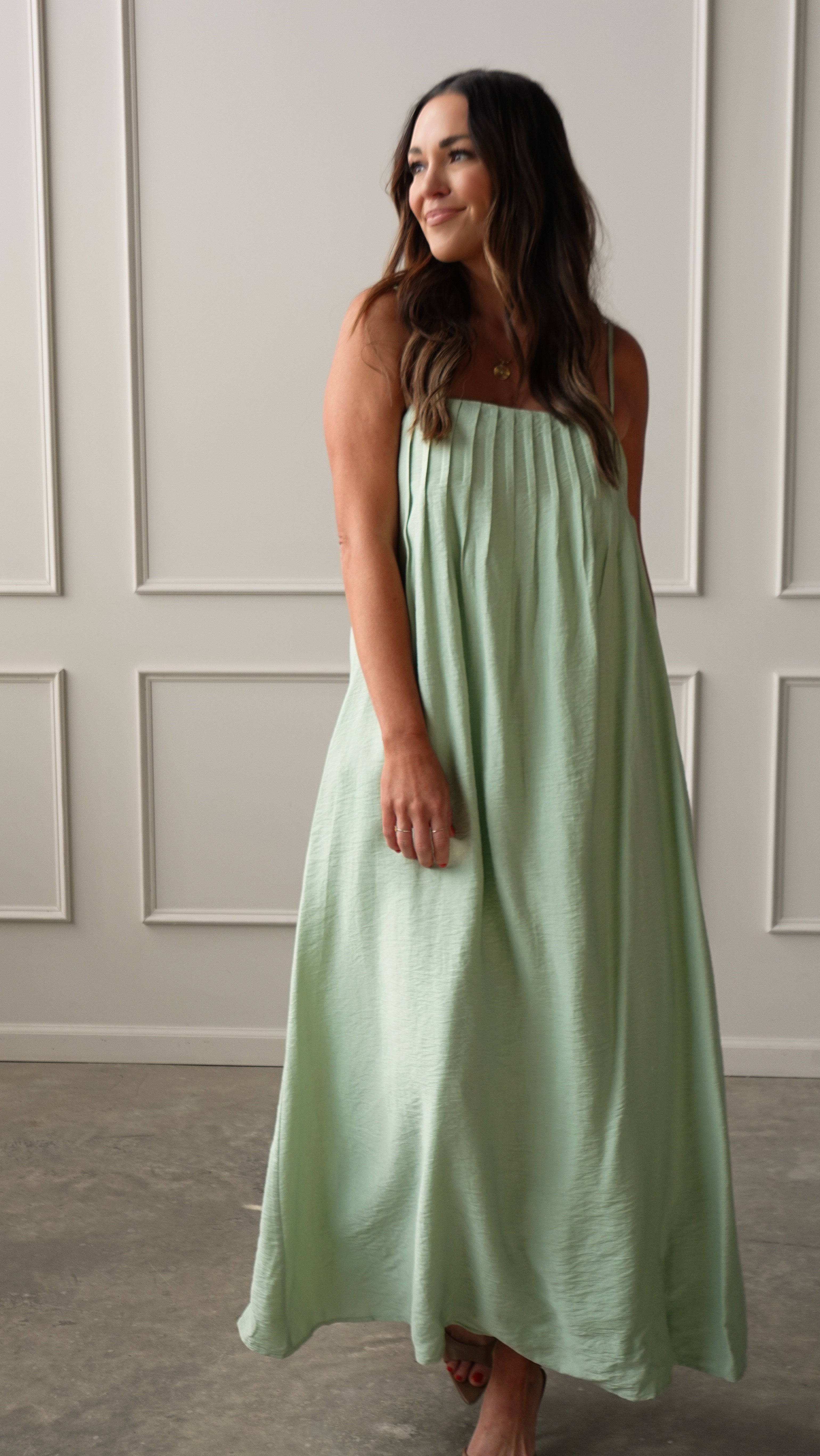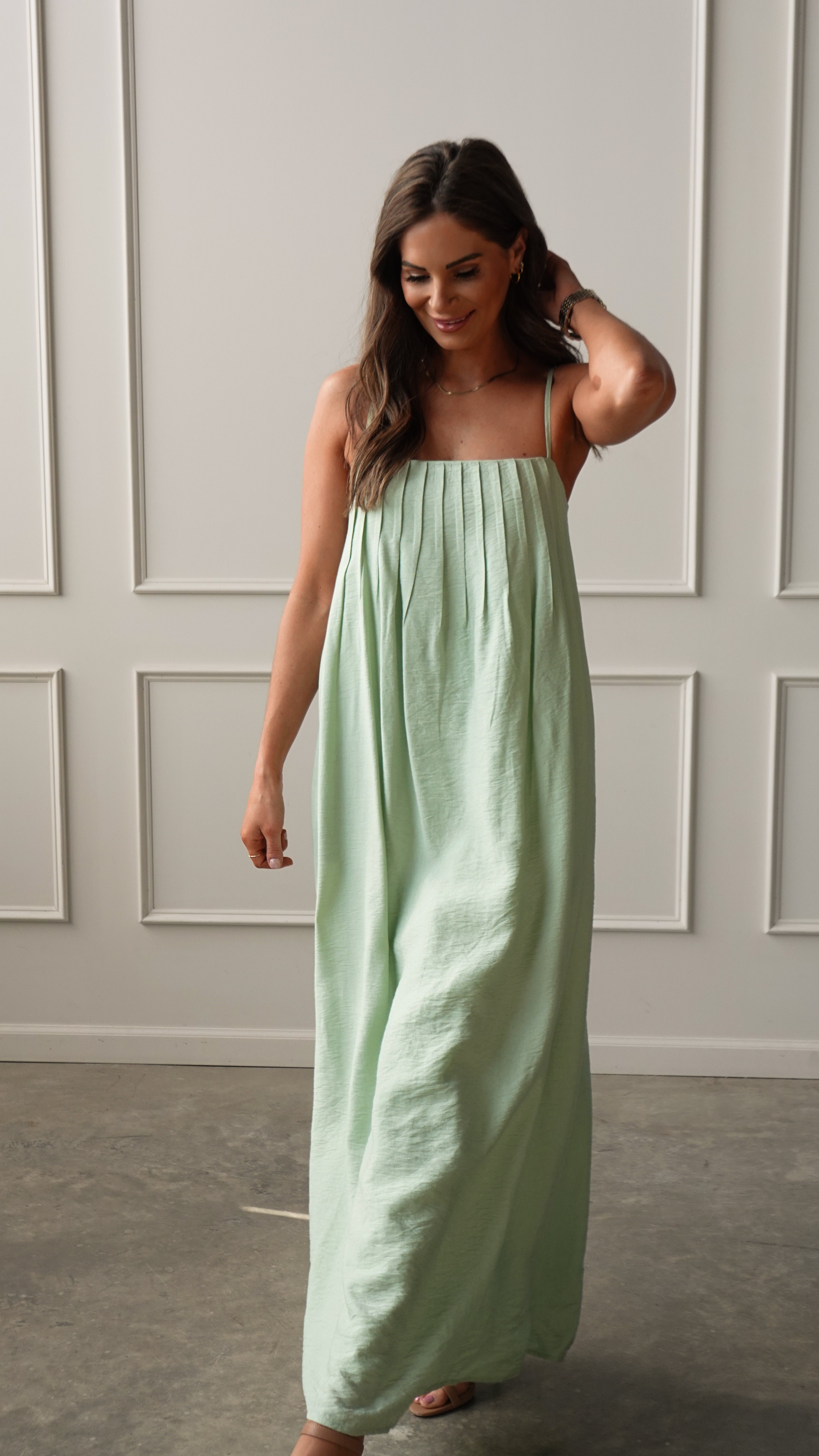 An airy maxi in the softest shade of mint green. Designed with a relaxed drape and delicate straps, this dress feels light, effortless, and quietly beautiful — the kind you’ll pack for every warm-weather plan.