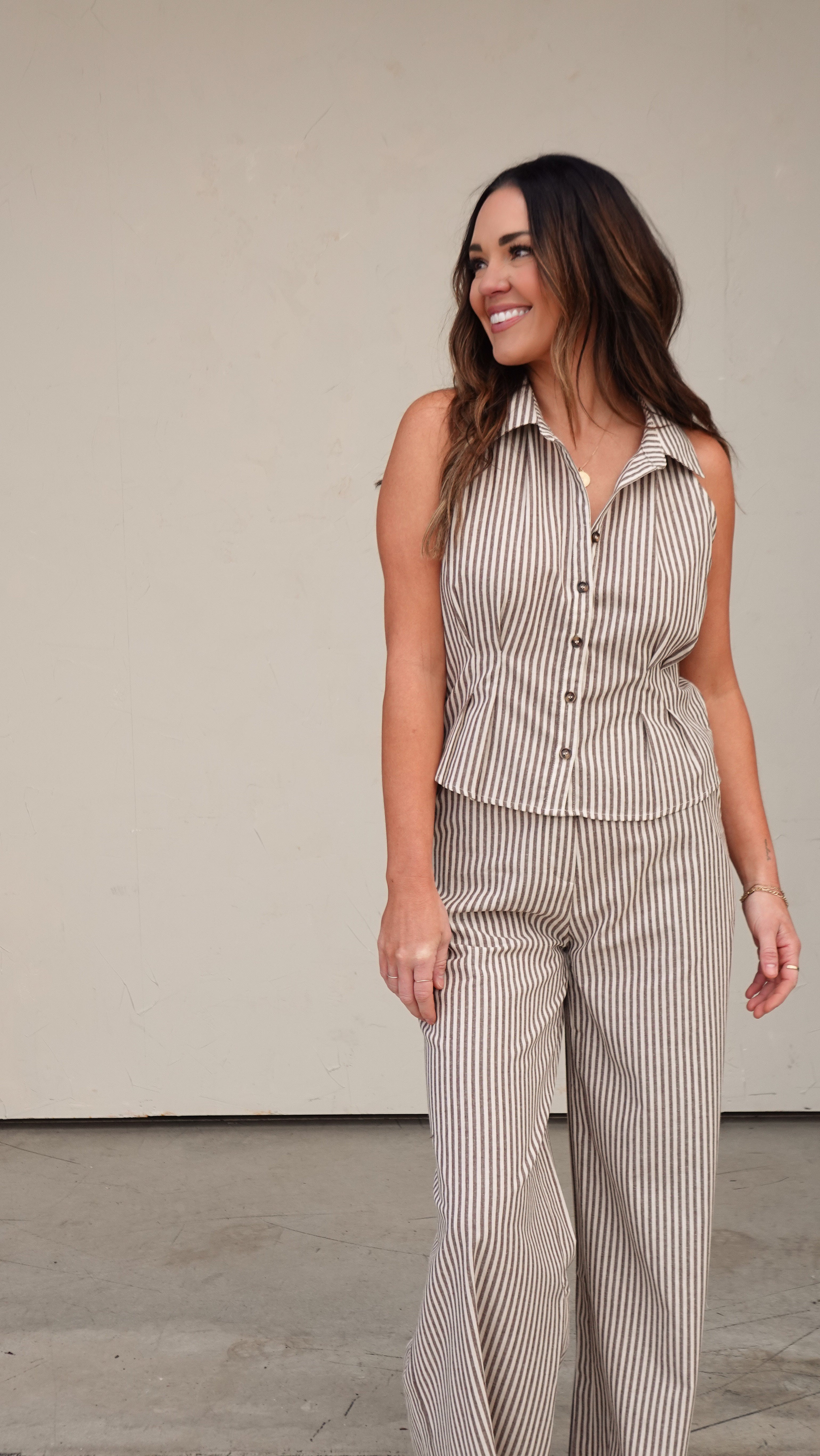 A tailored sleeveless button-down in the most timeless stripe. The ideal piece to transition from workwear to dinner plans!