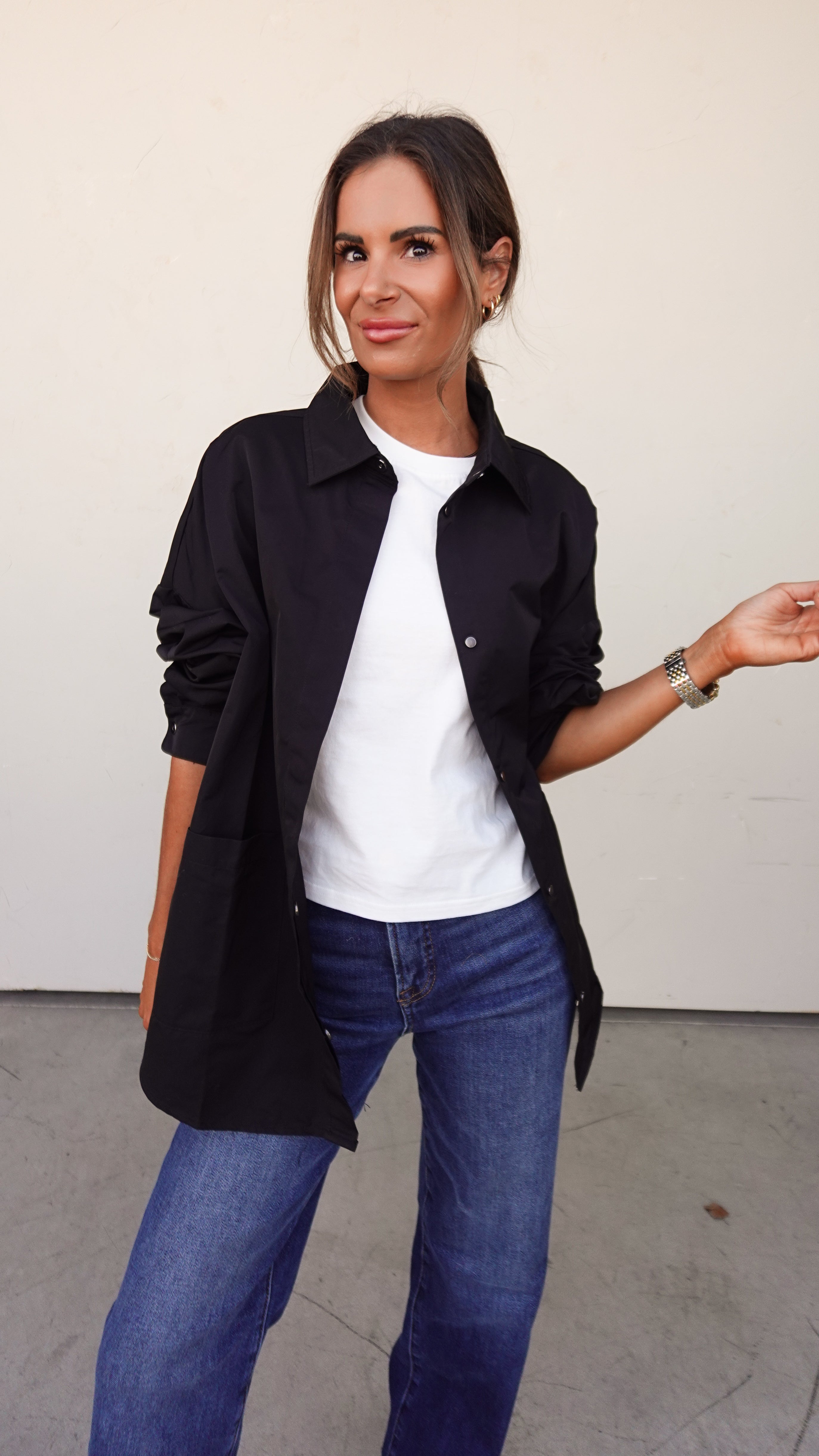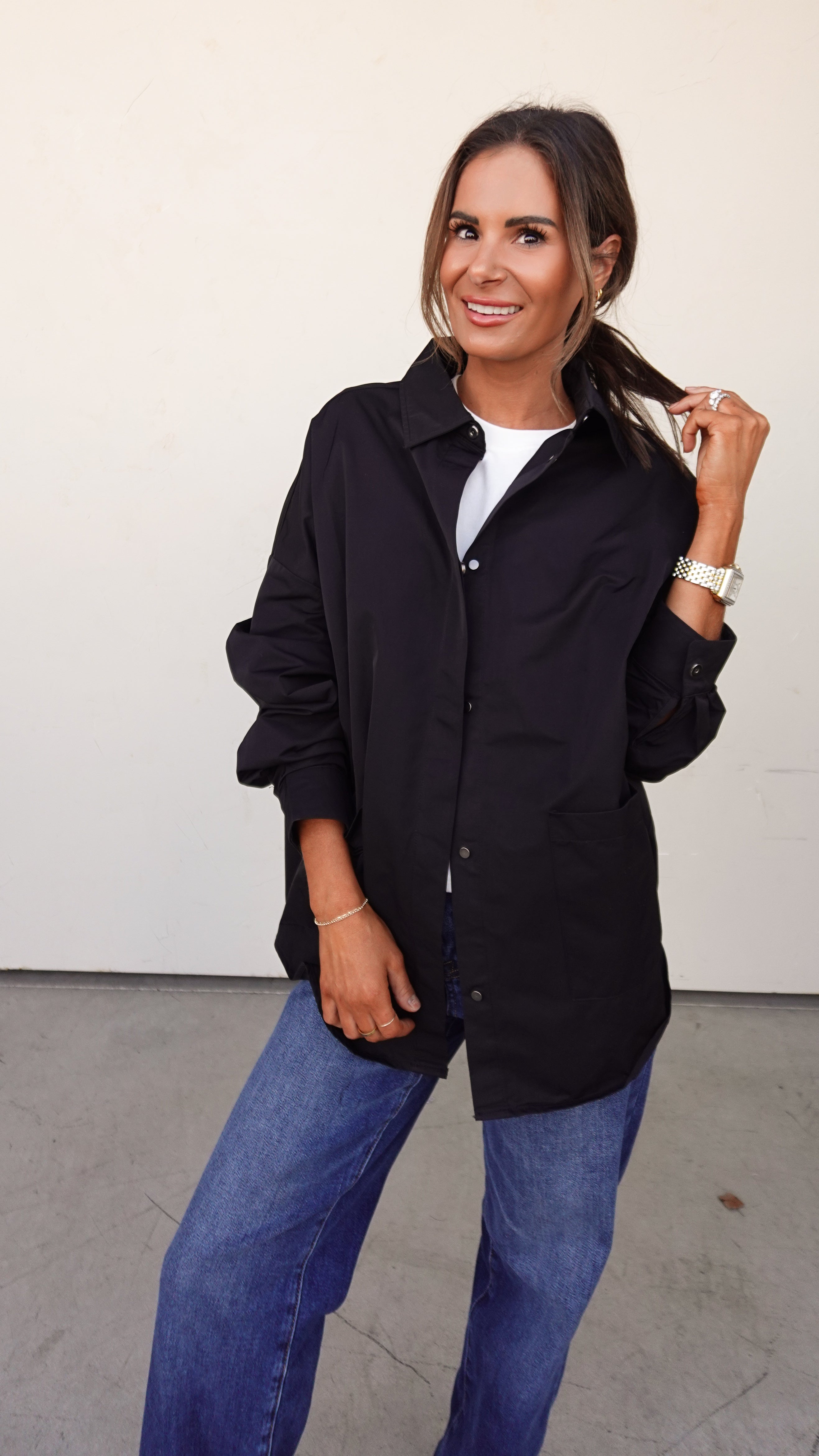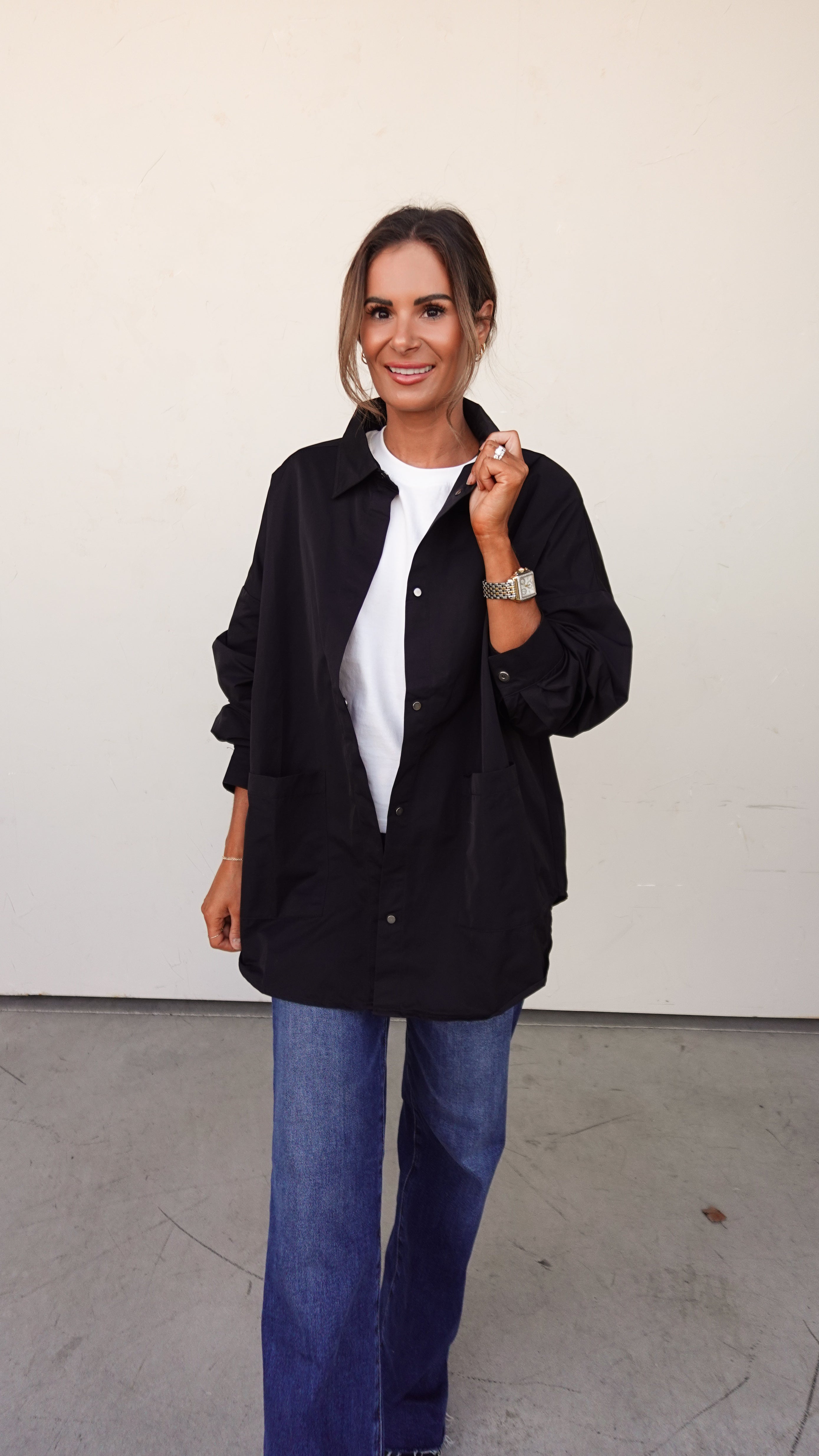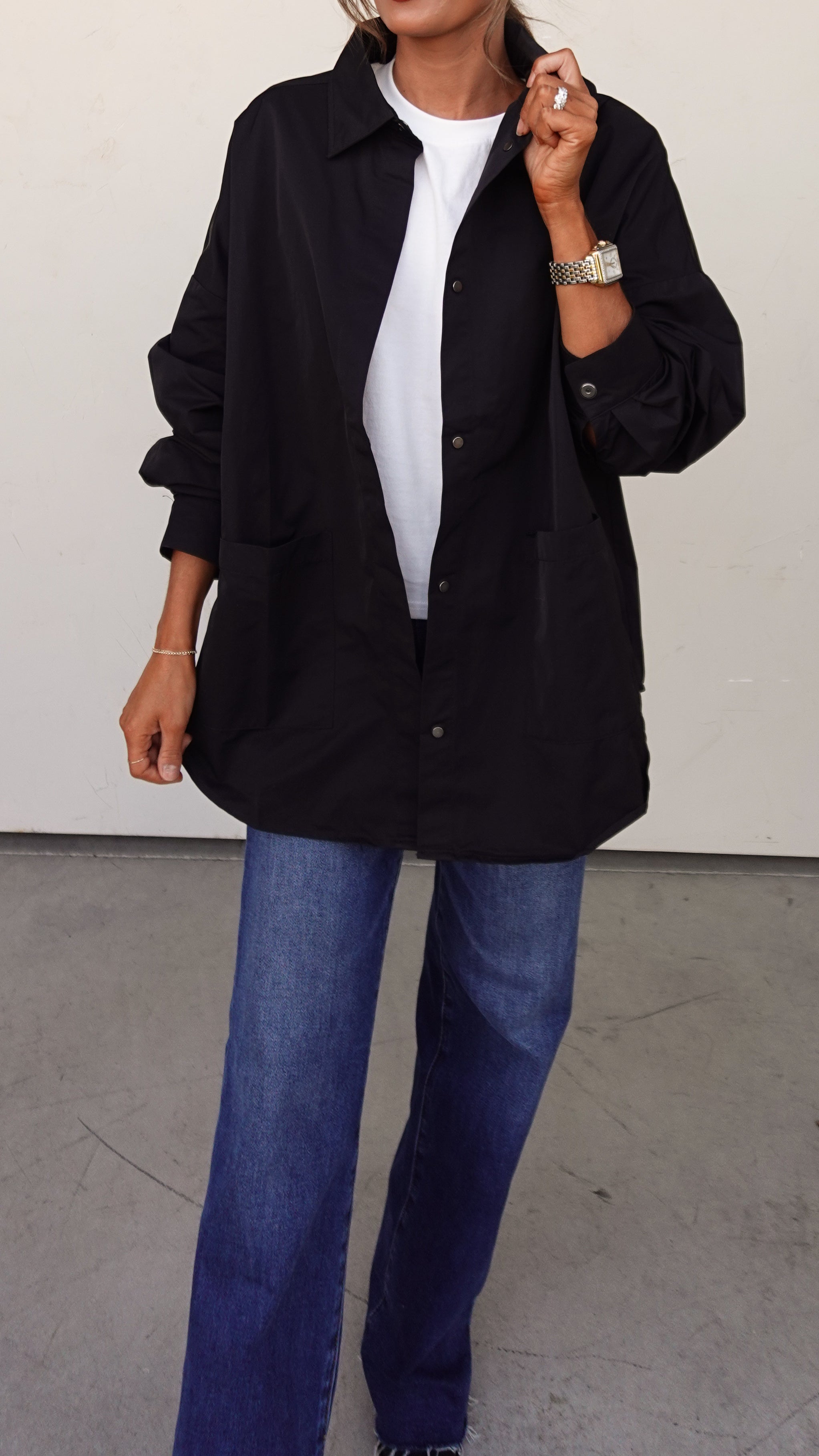 Lightweight black woven jacket with a relaxed fit (texture feels similar to nylon!)