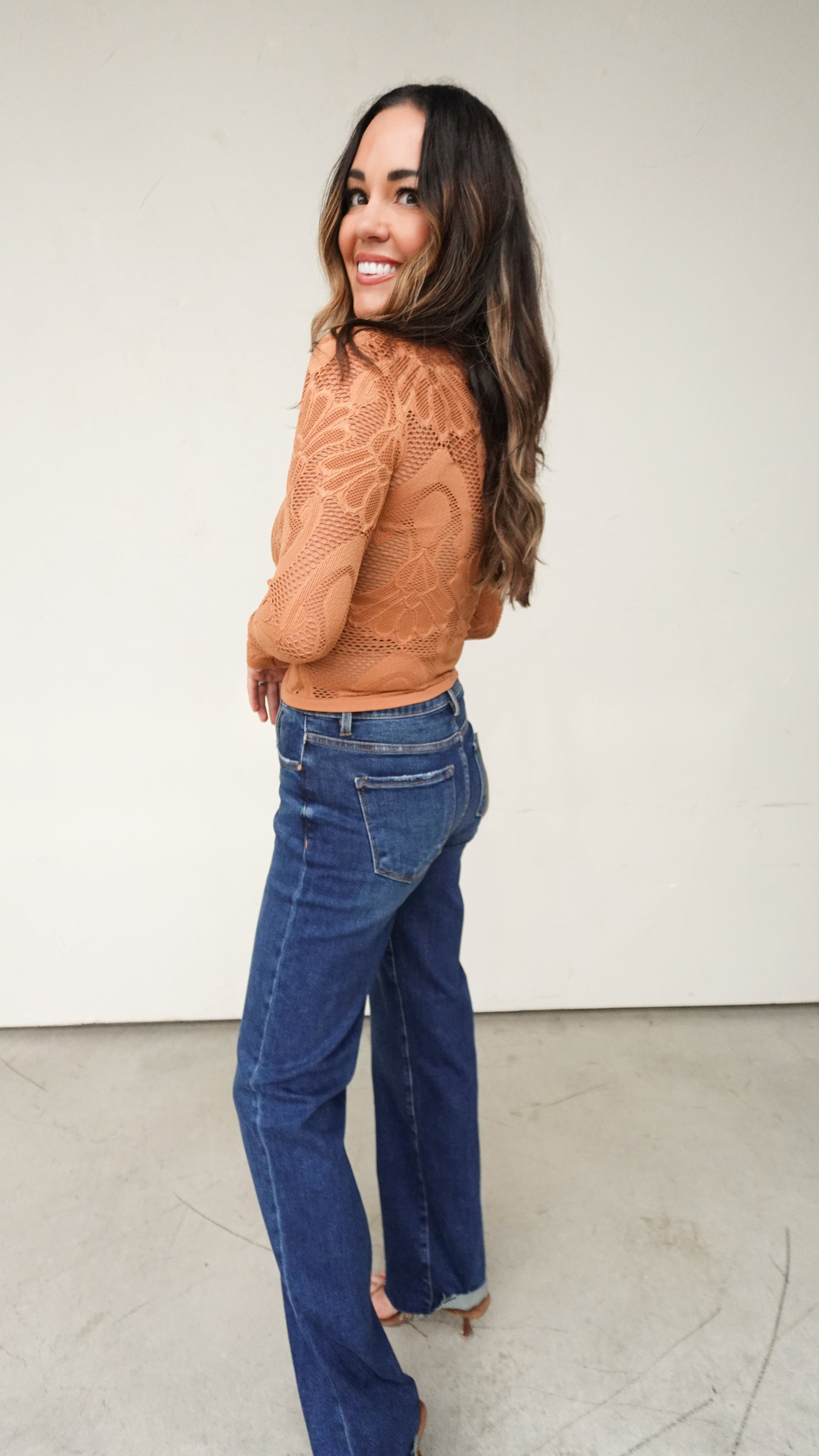 - Camel colored seamless top with fishnet and floral jacquard texture