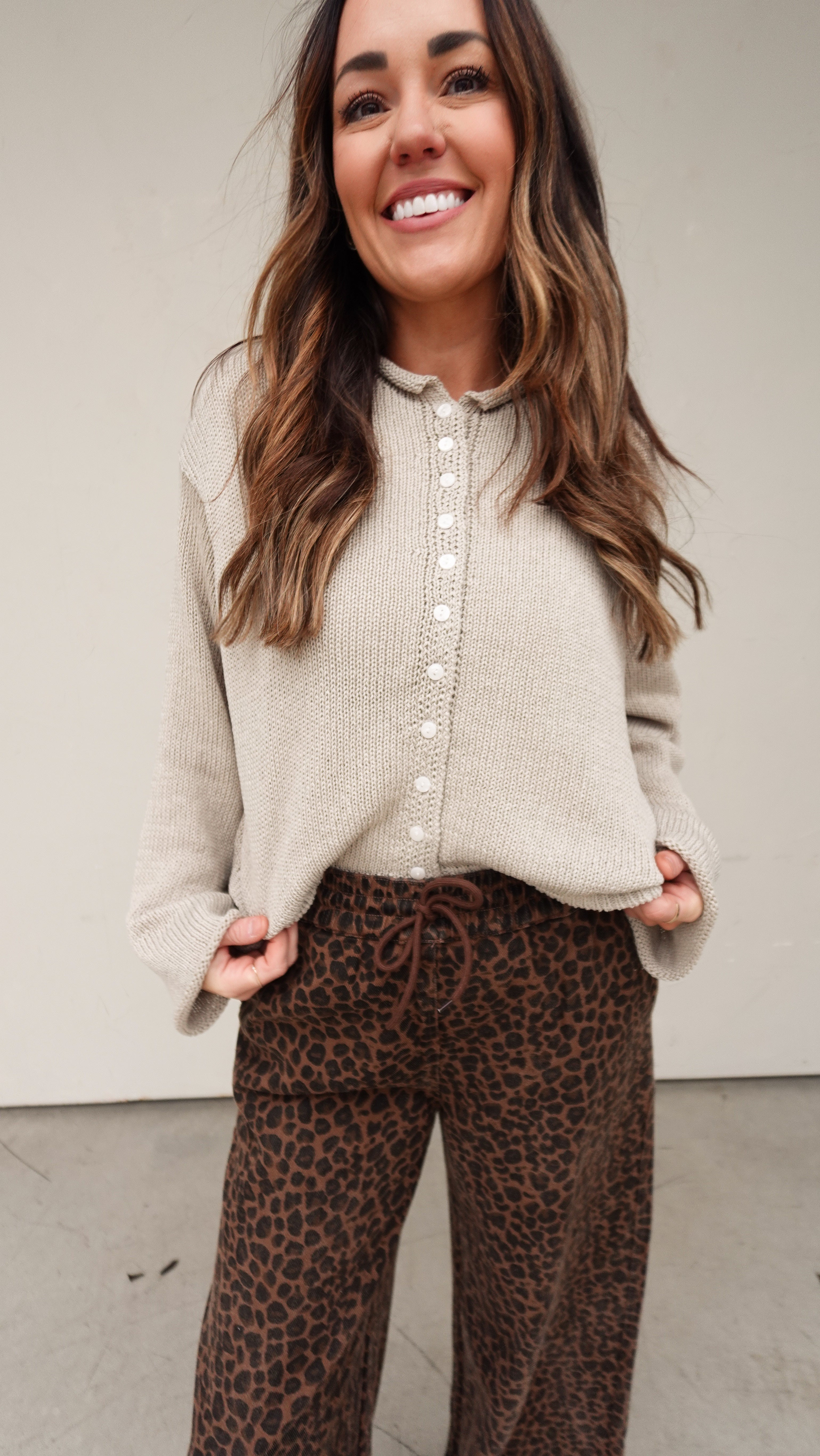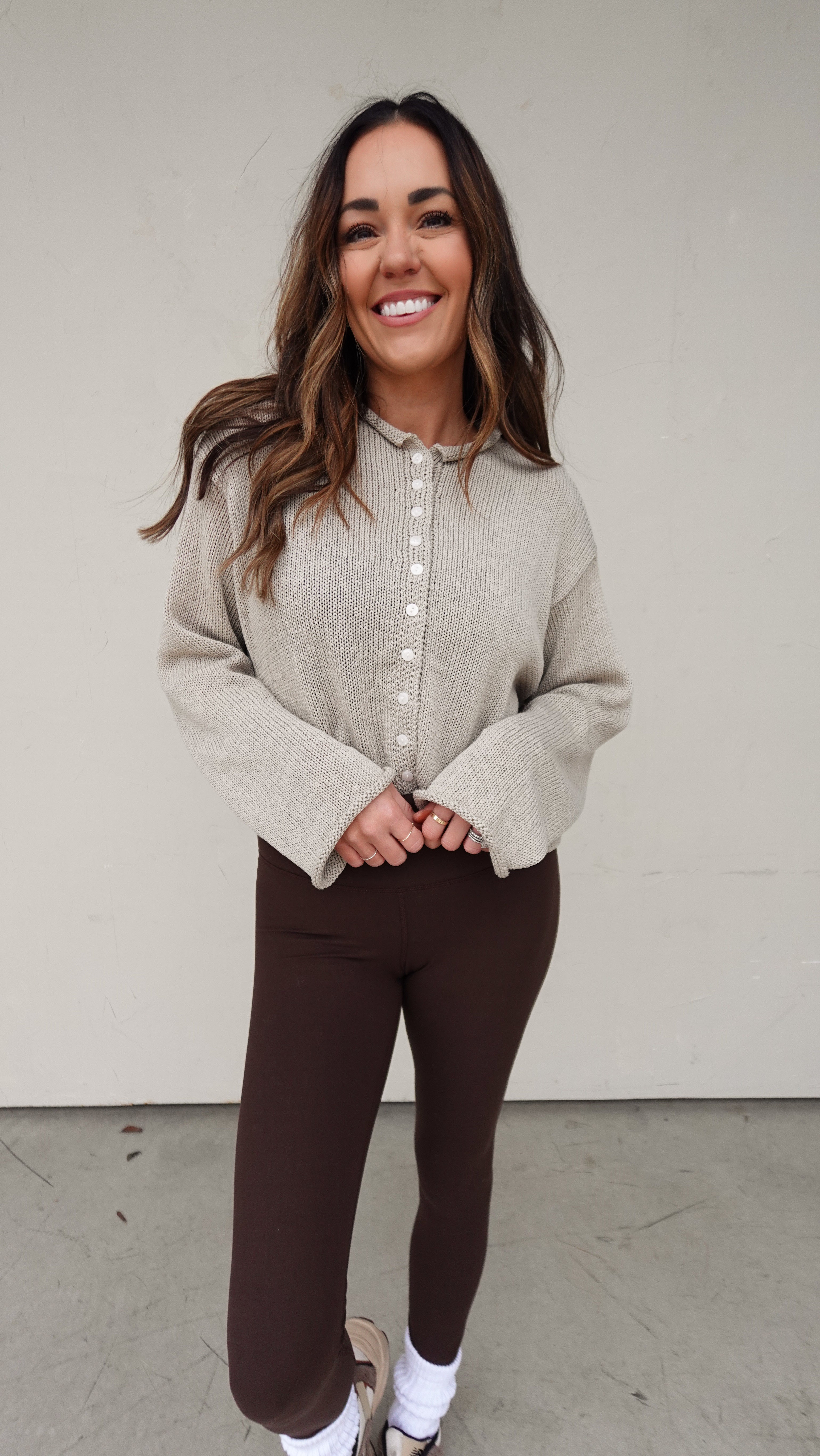 - Lightweight neutral stone-colored cardigan with functional buttons