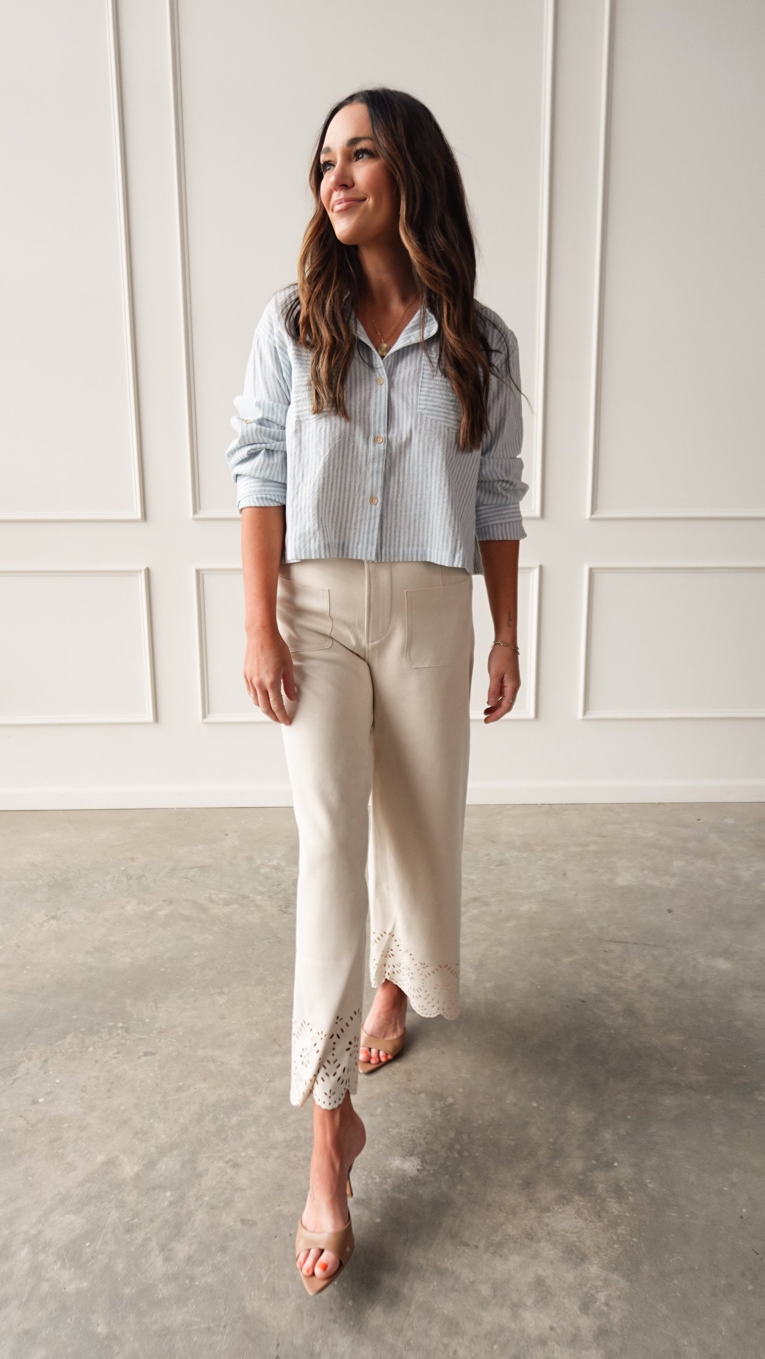 The Blue Striped Linen Button-Down is crisp, breathable, and effortless—perfect for layering, styling as a set piece, or wearing open over a tank for a relaxed vibe.