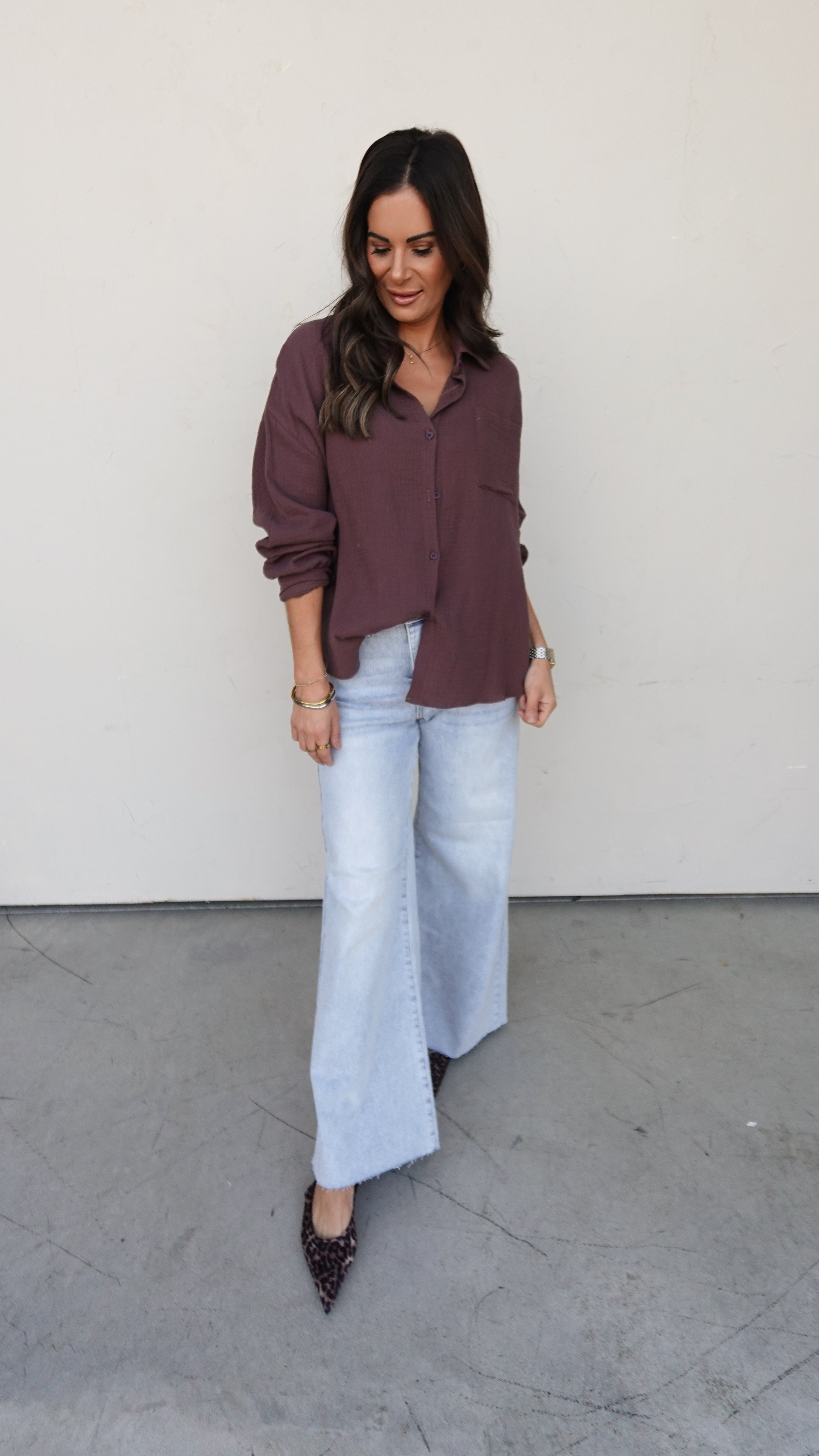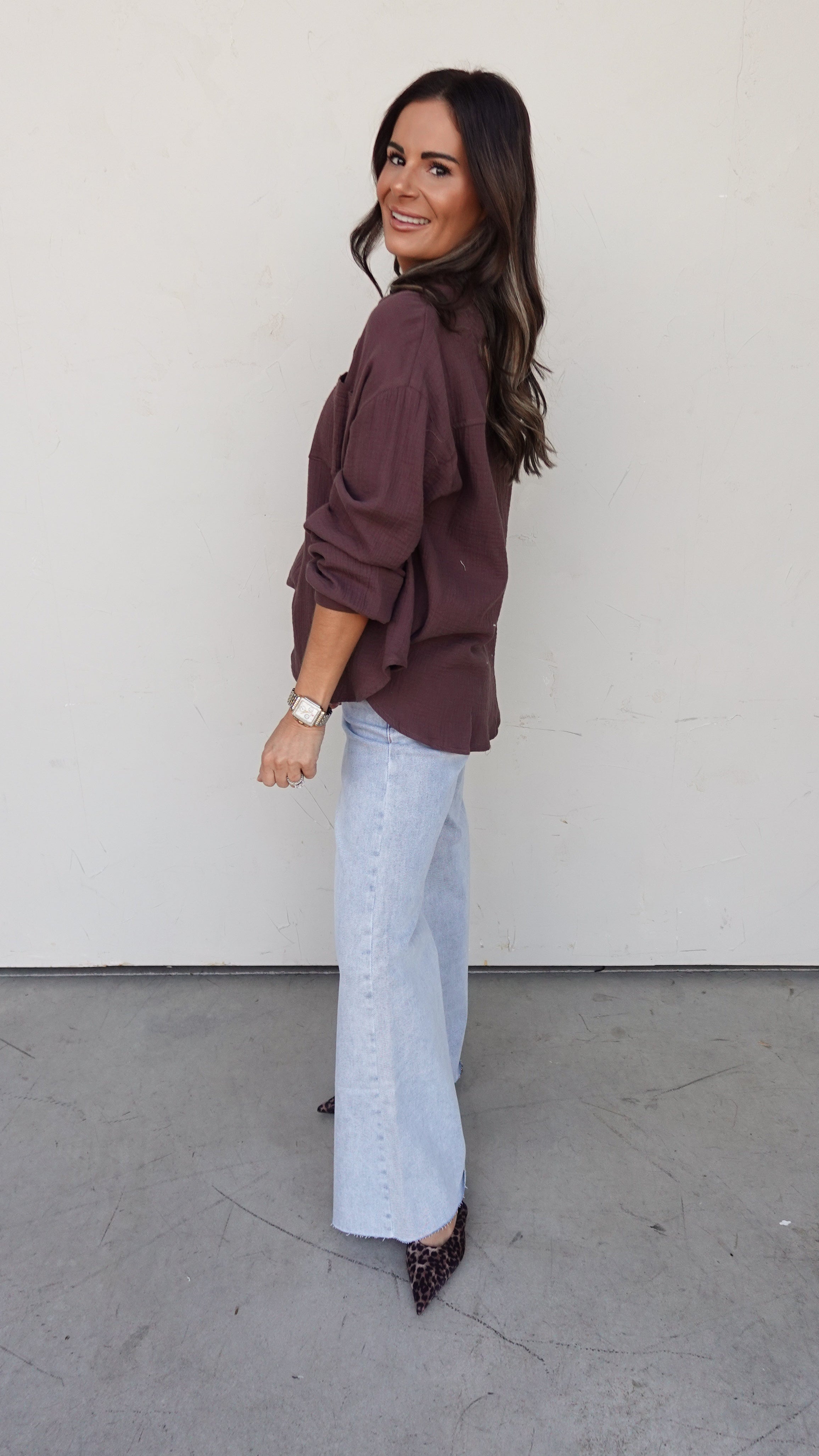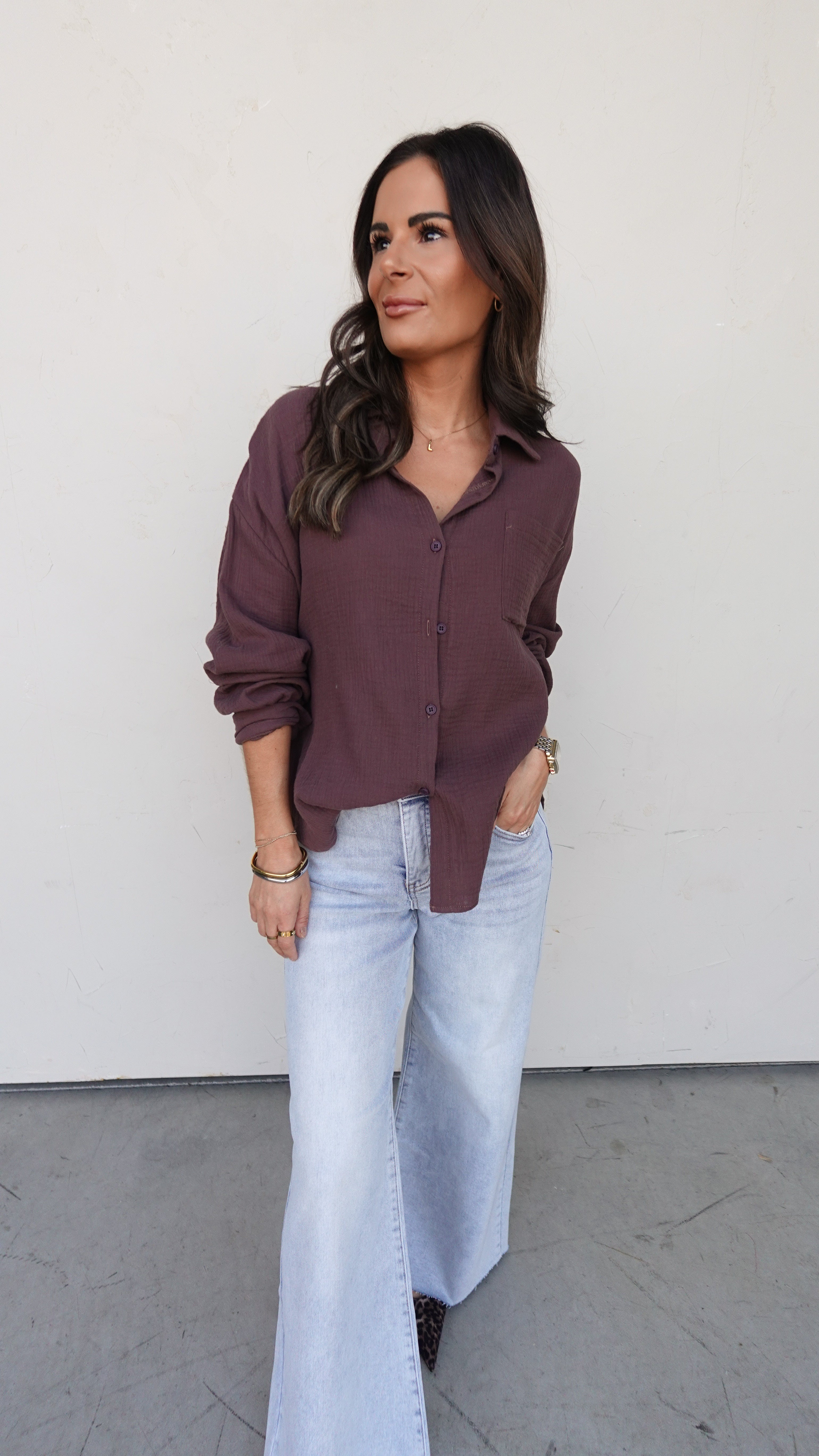 Button-front top with a relaxed, drapey fit — wear it fully closed, half-tucked, or open as a lightweight layer