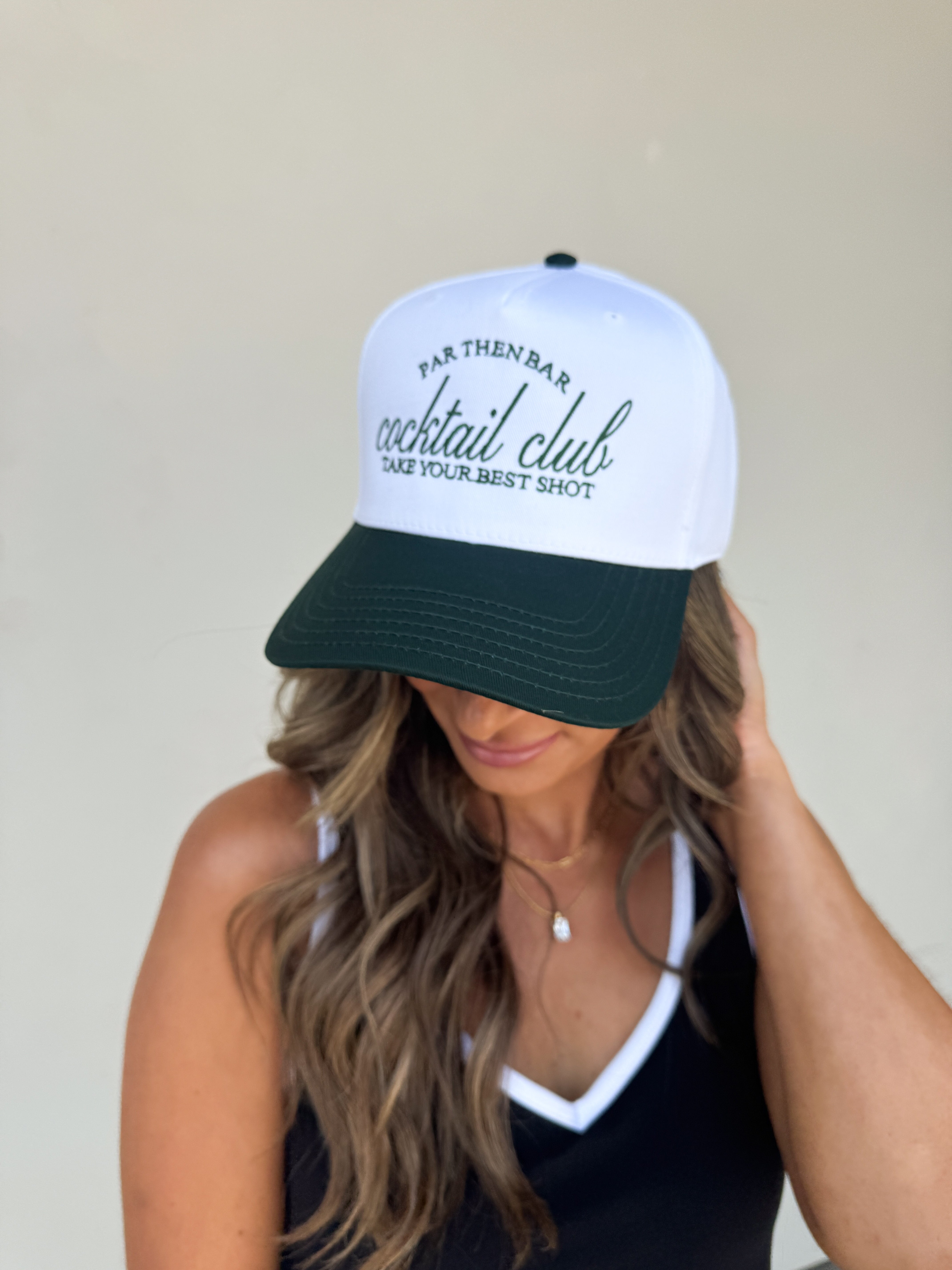 - Embroidered on a dark green/white 5 panel hat in dark green thread