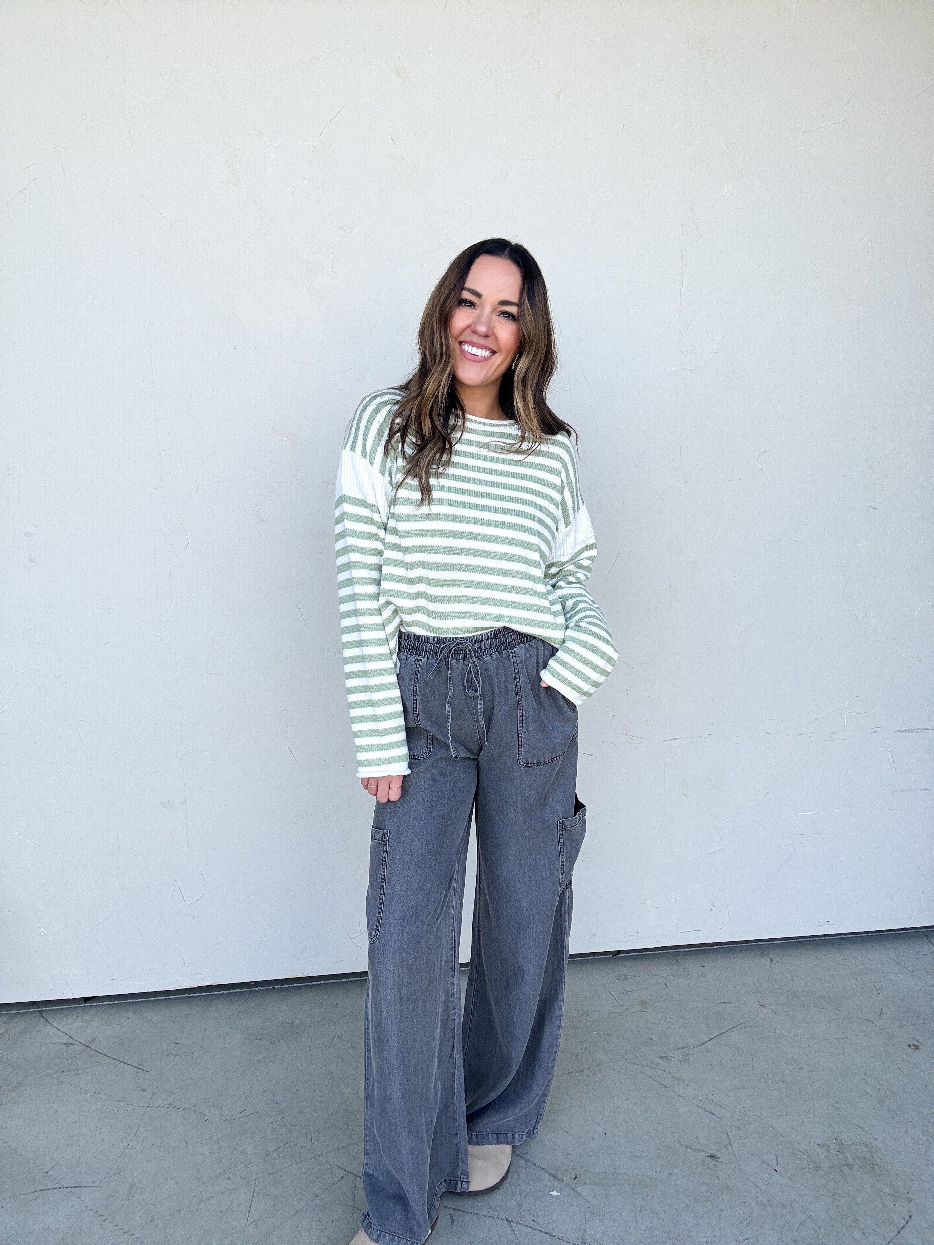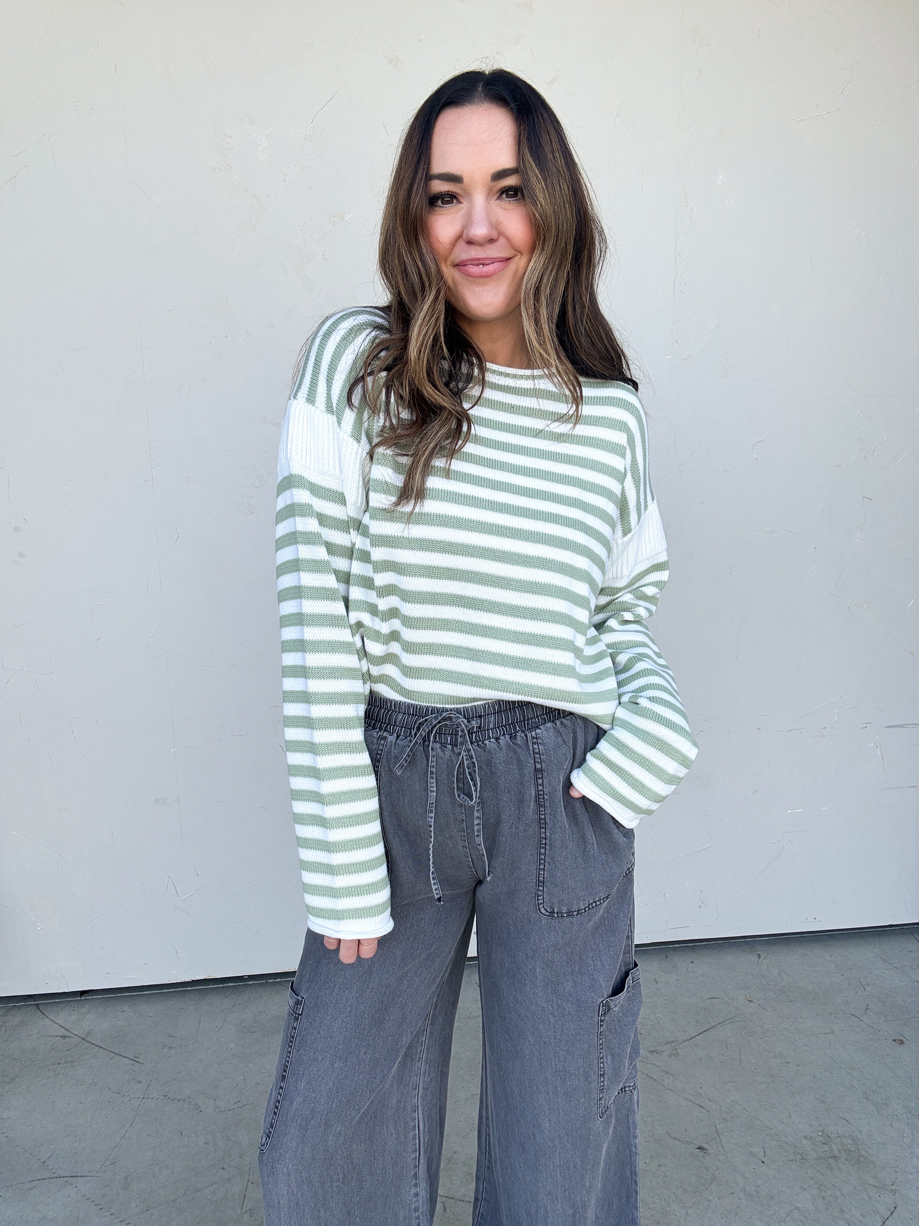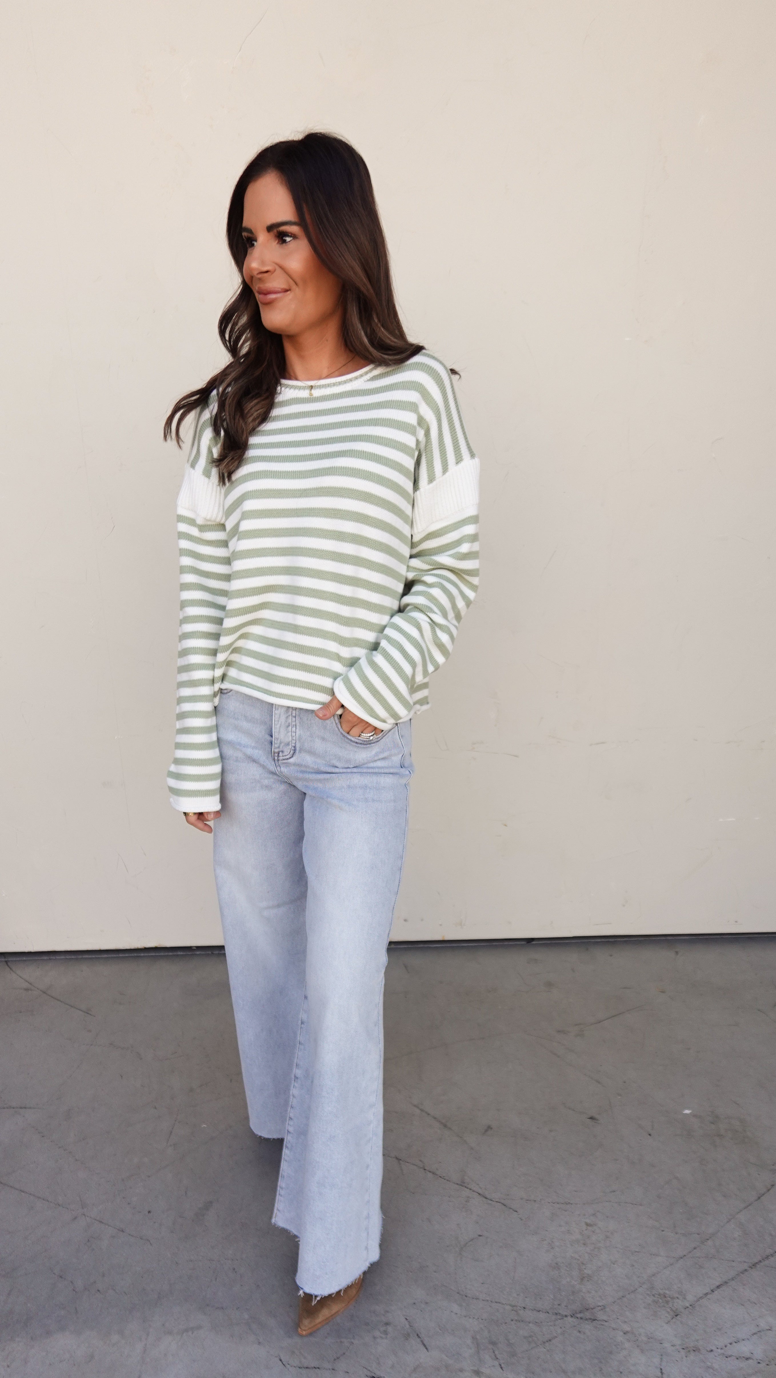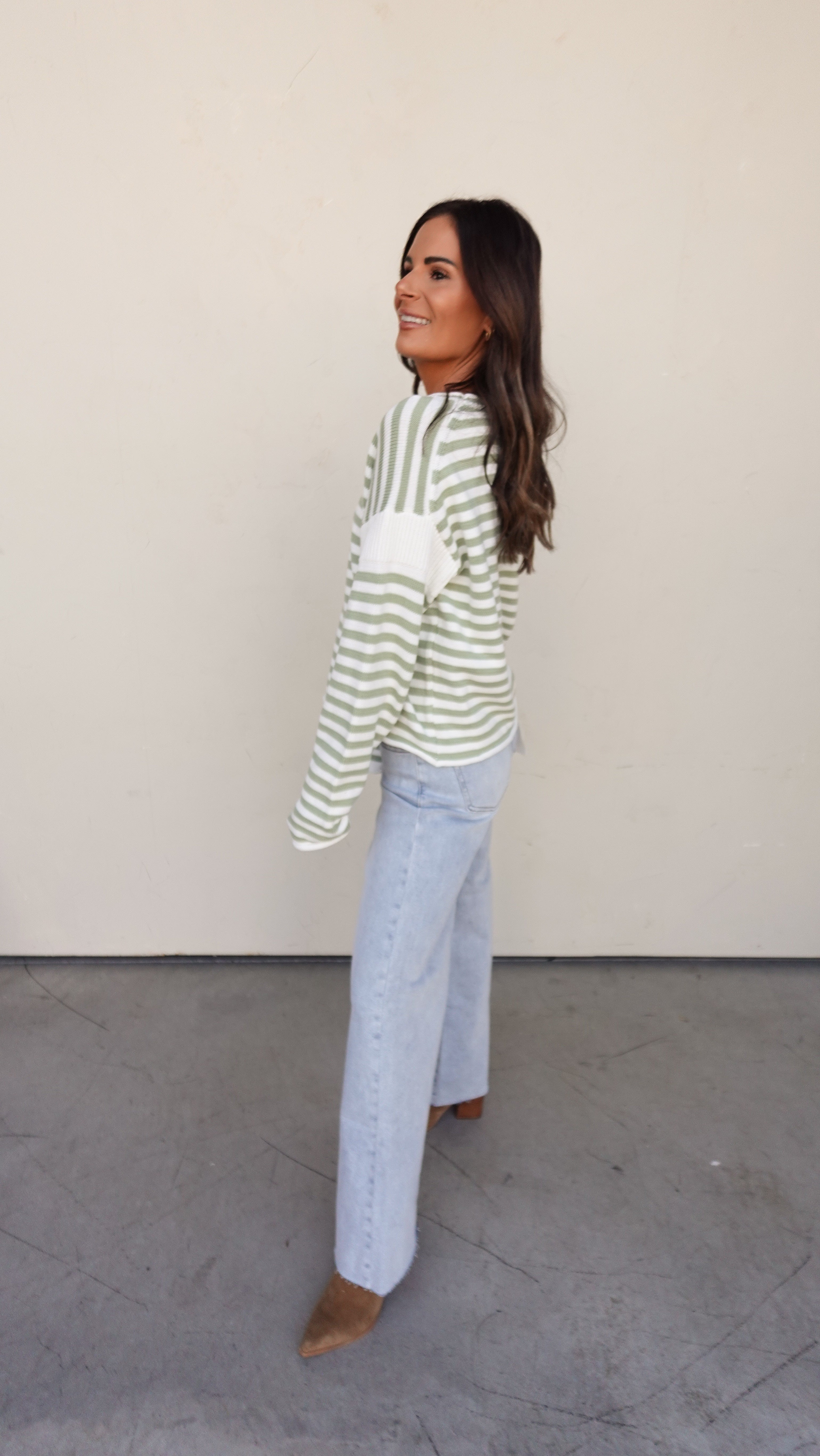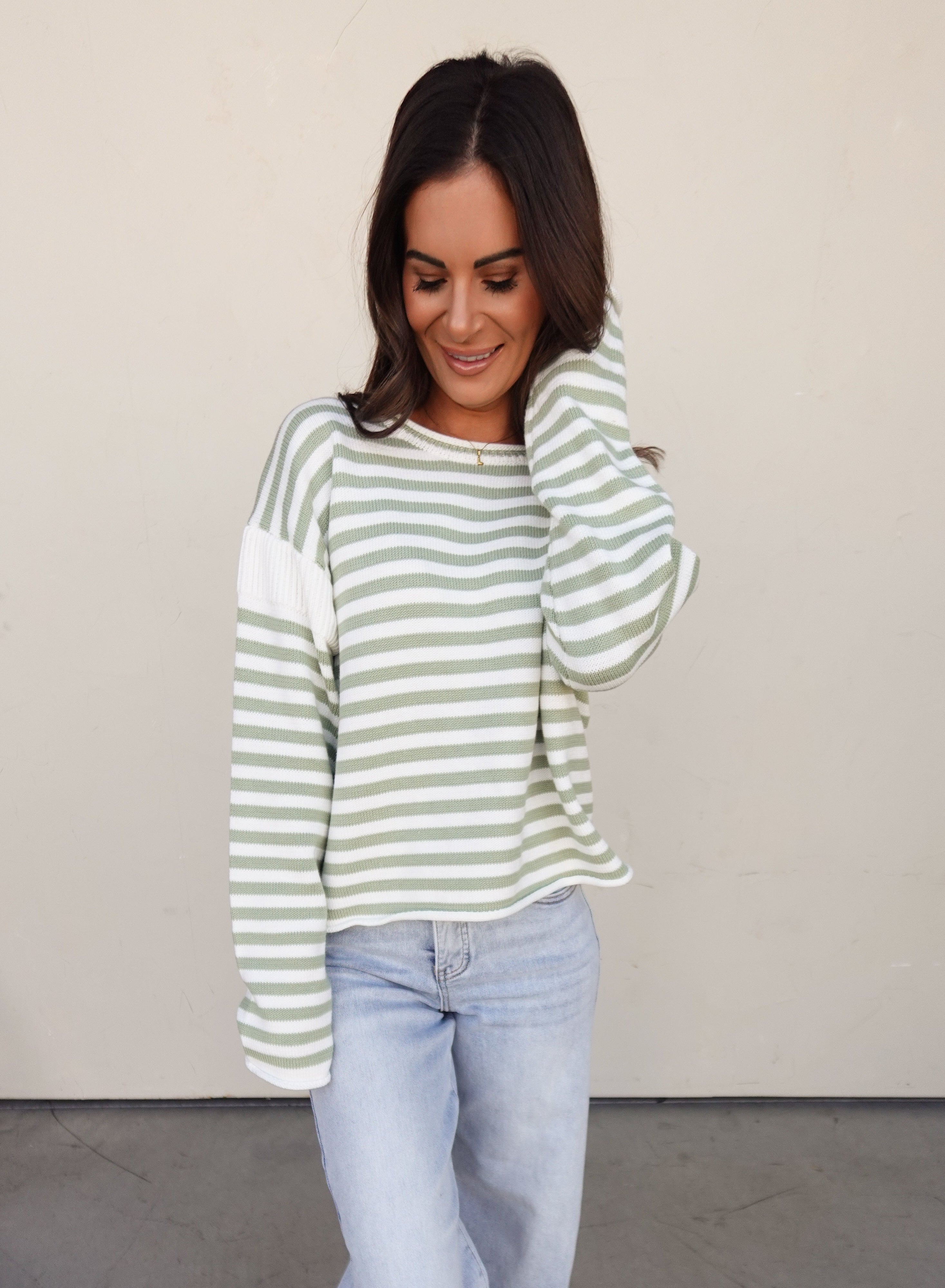 A fresh, feel-good striped knit in soft sage and creamy white — basically a little burst of calm, cozy energy for your wardrobe.