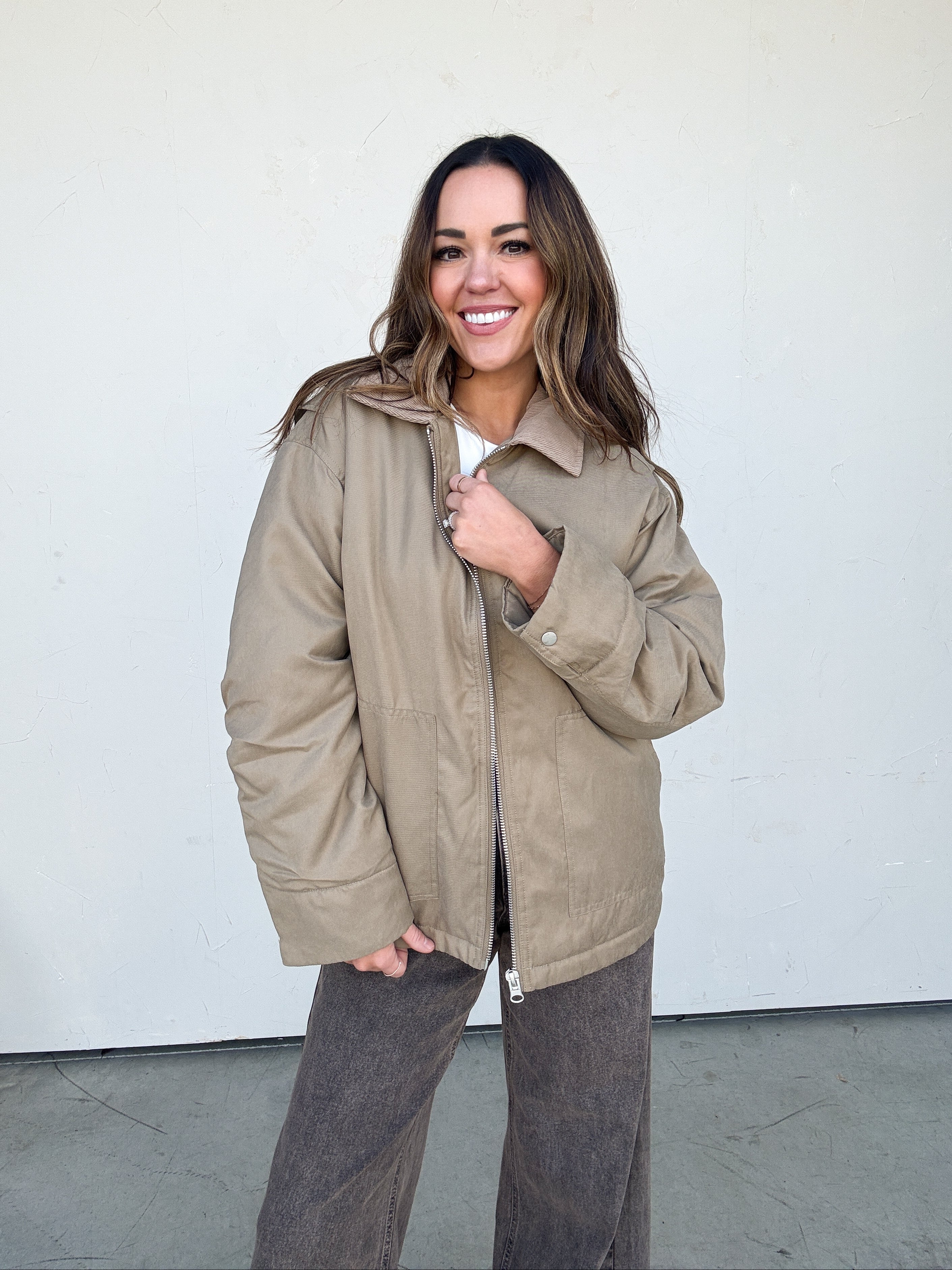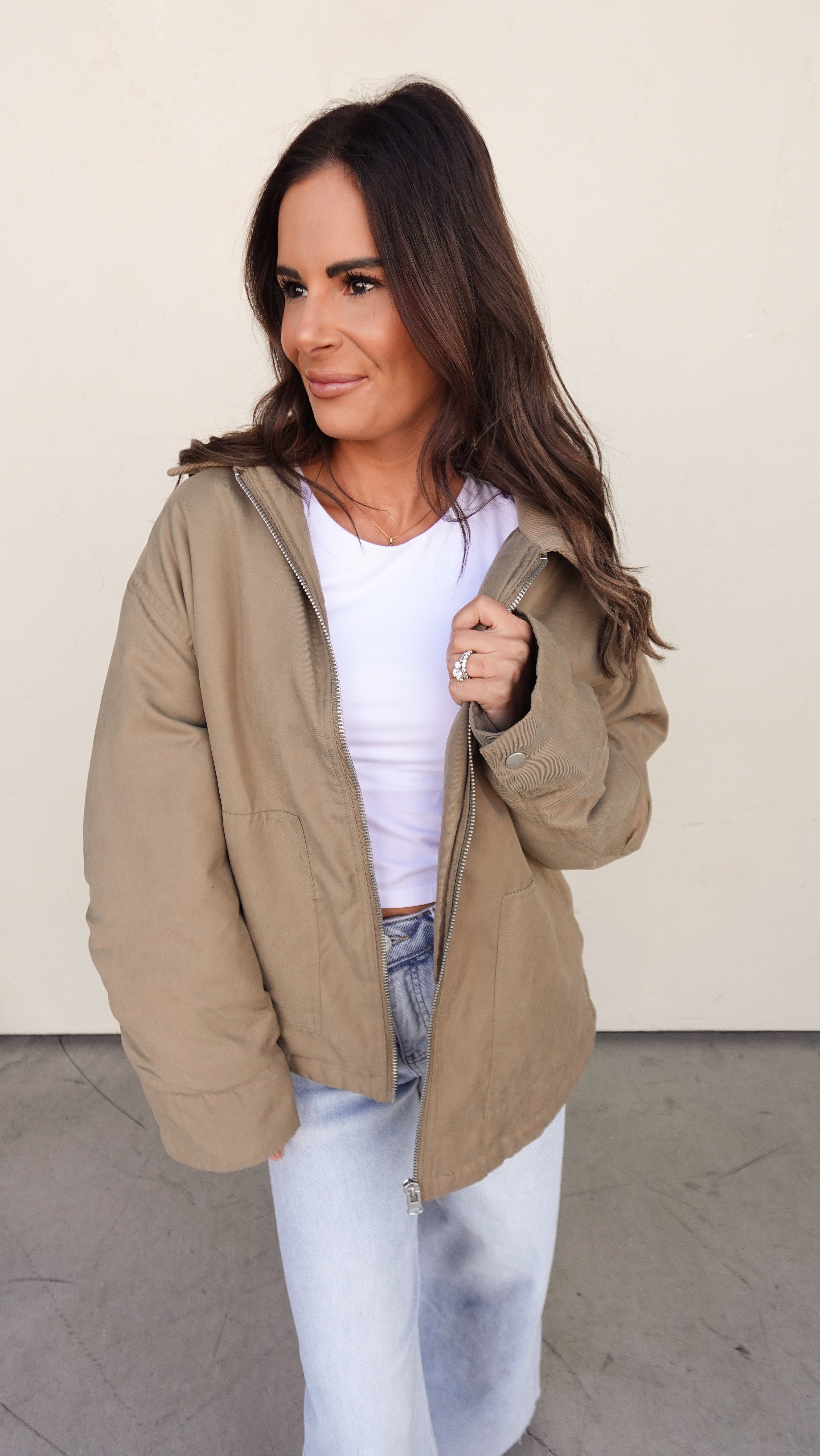 A laid-back, goes-with-everything zip jacket a soft washed olive tone