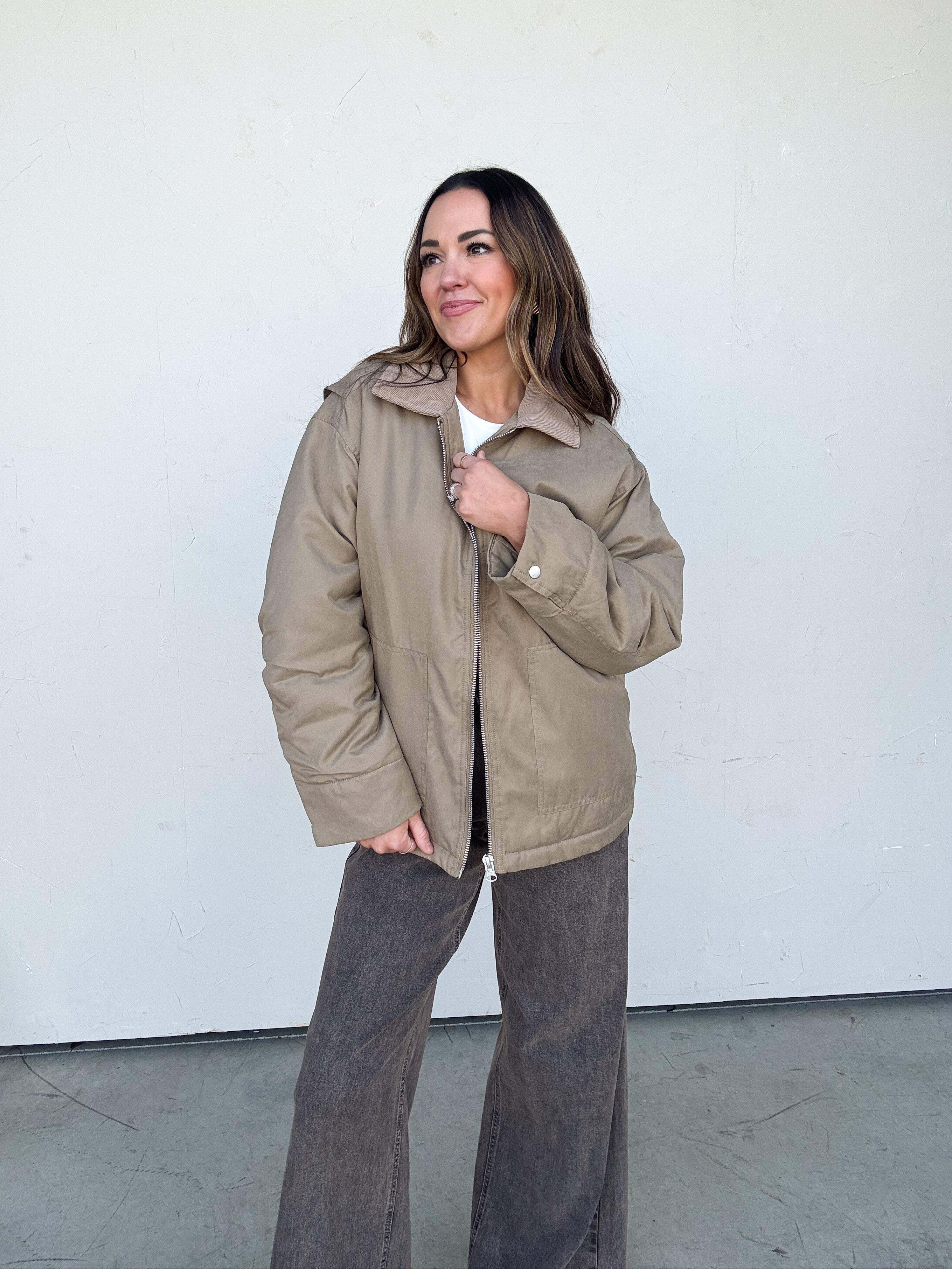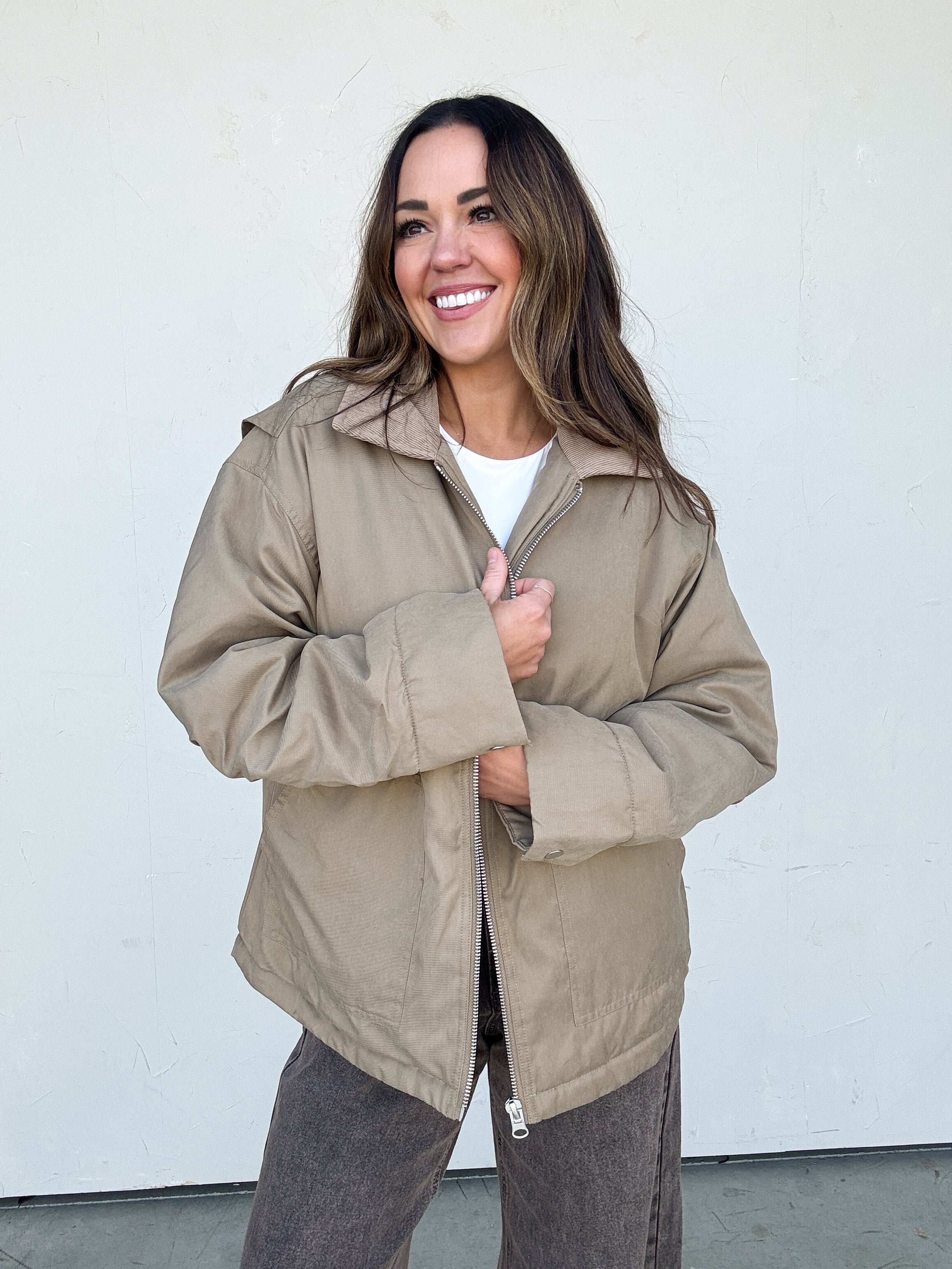 Features a foldover corduroy collar, full zip front, and subtle stitching for that elevated utility vibe