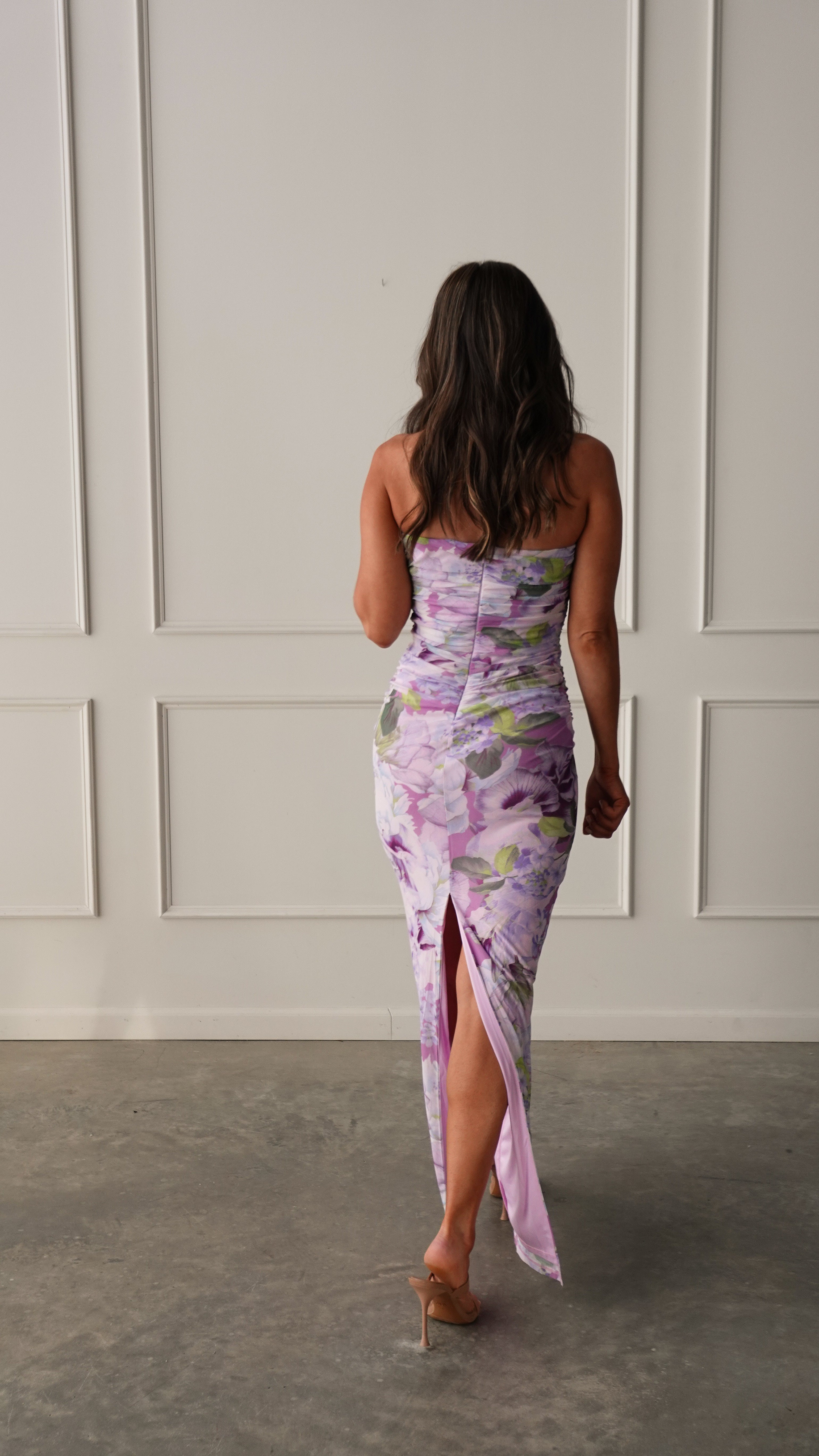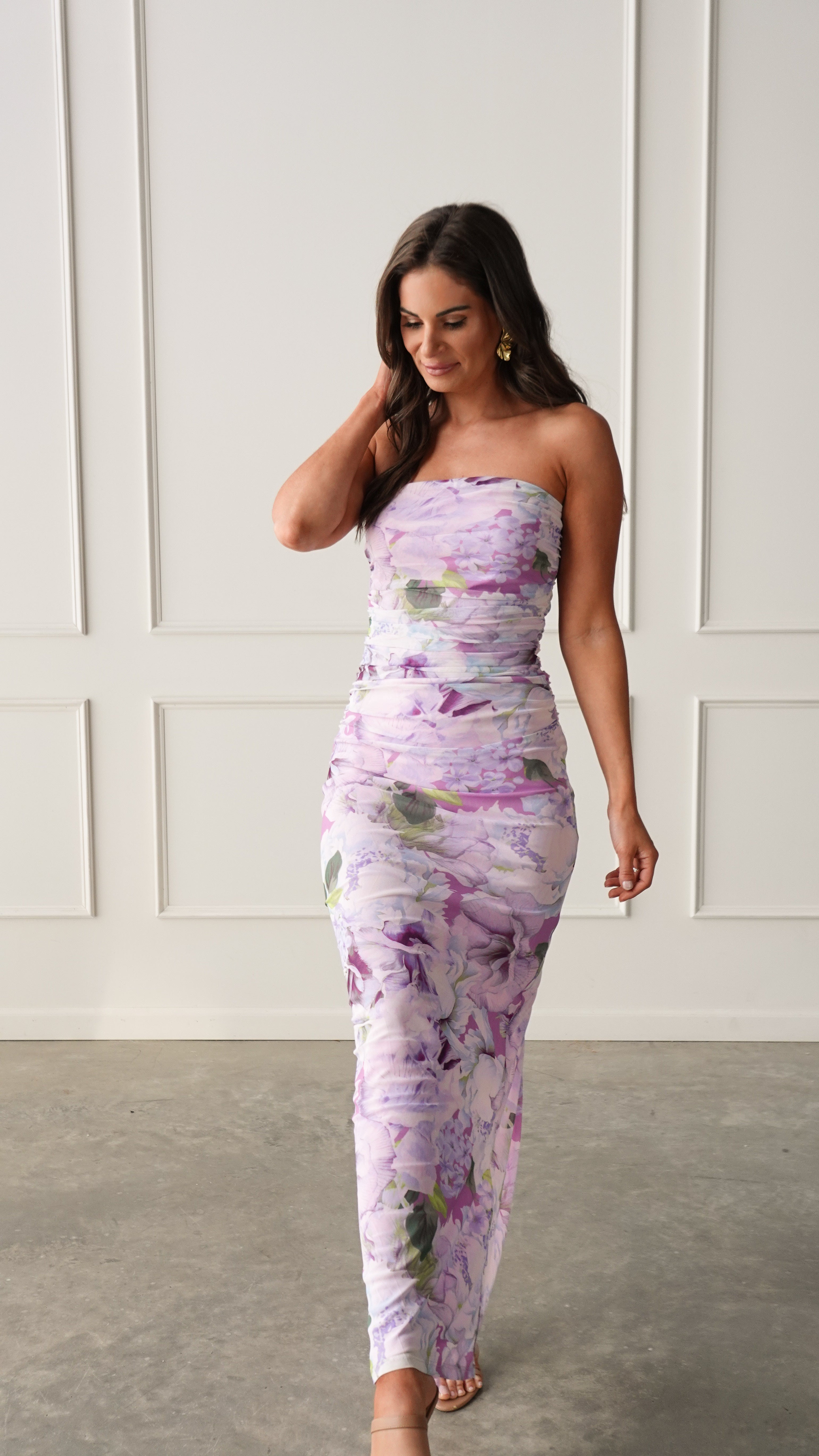 This strapless floral maxi dress features a flattering body-skimming fit with a dreamy pastel print that feels equal parts romantic and modern.
