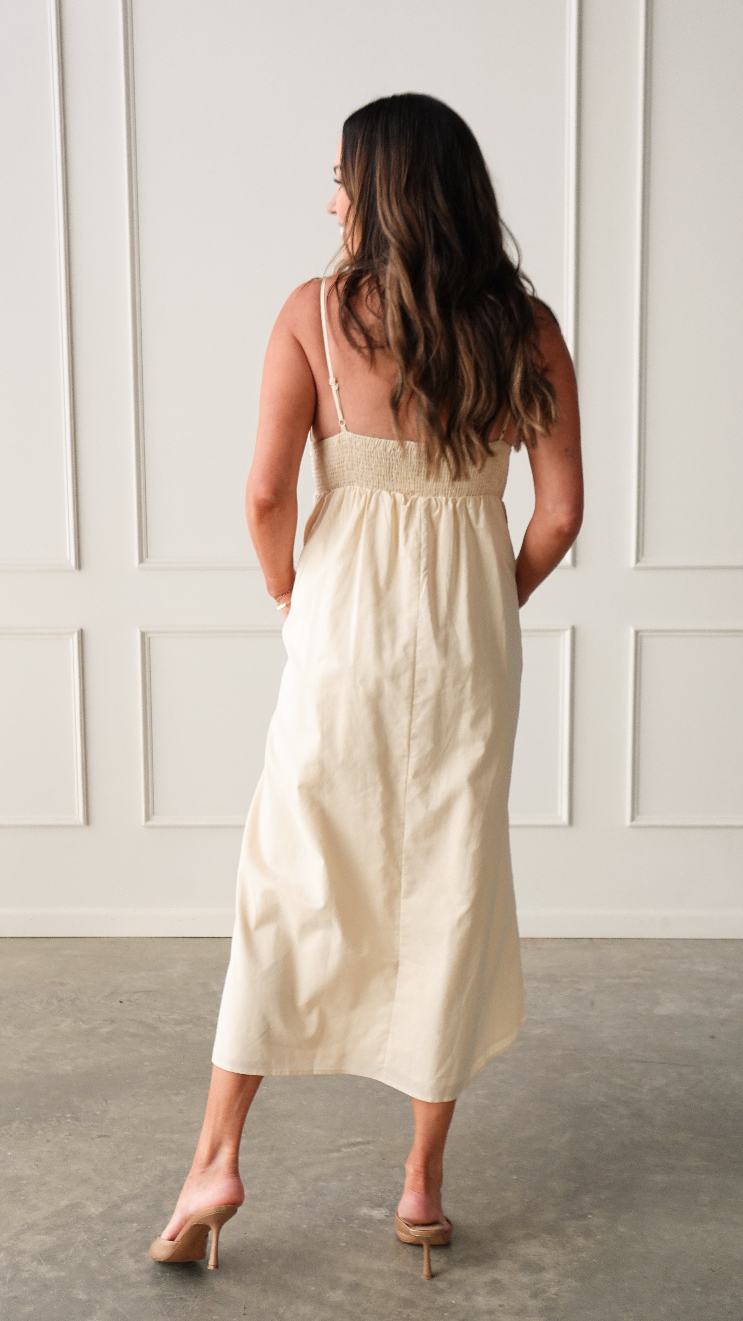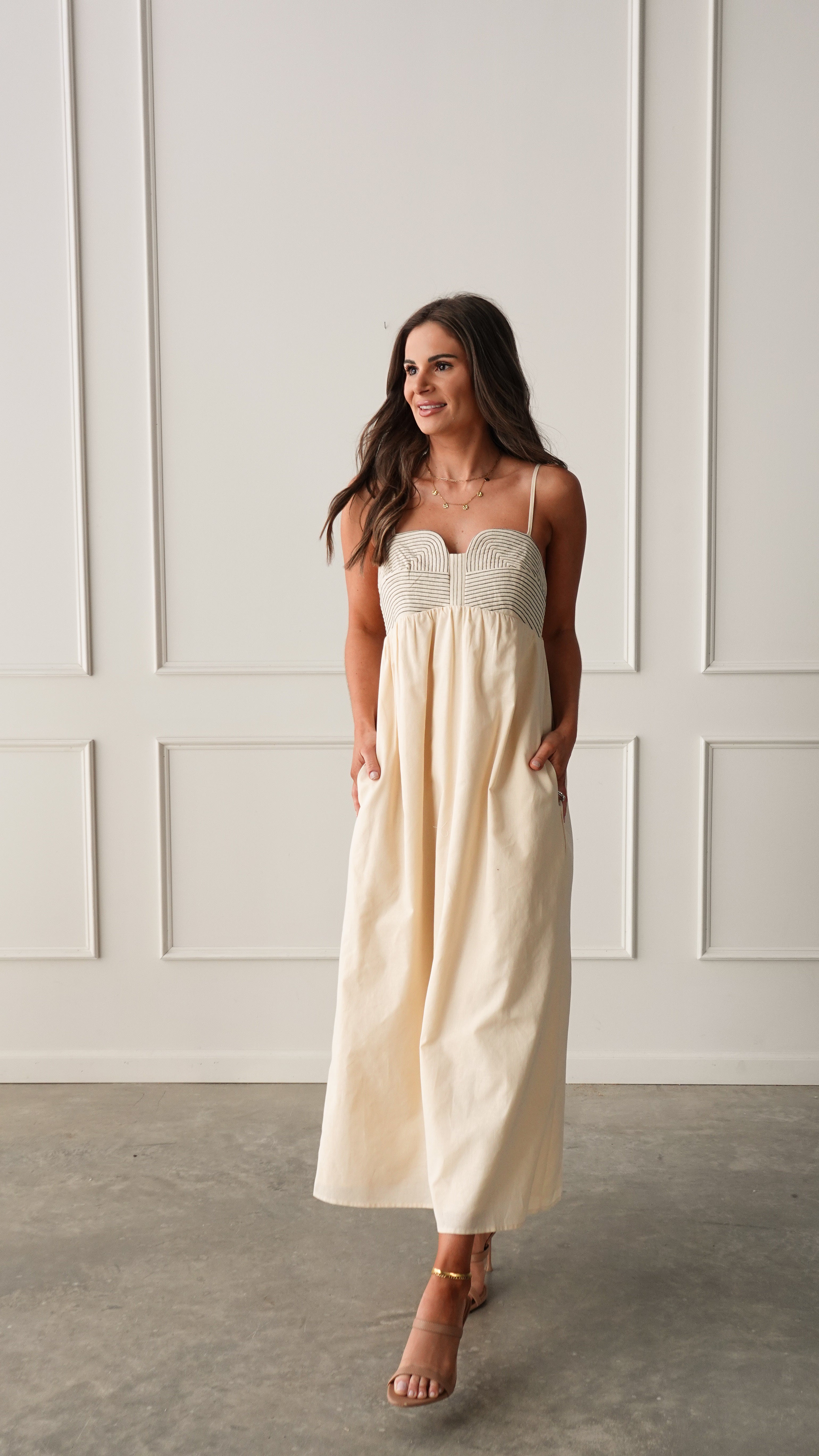 This cream midi dress features a delicate top-stitched bodice with a flowy, relaxed skirt for an easy, feminine look that feels dreamy and wearable.