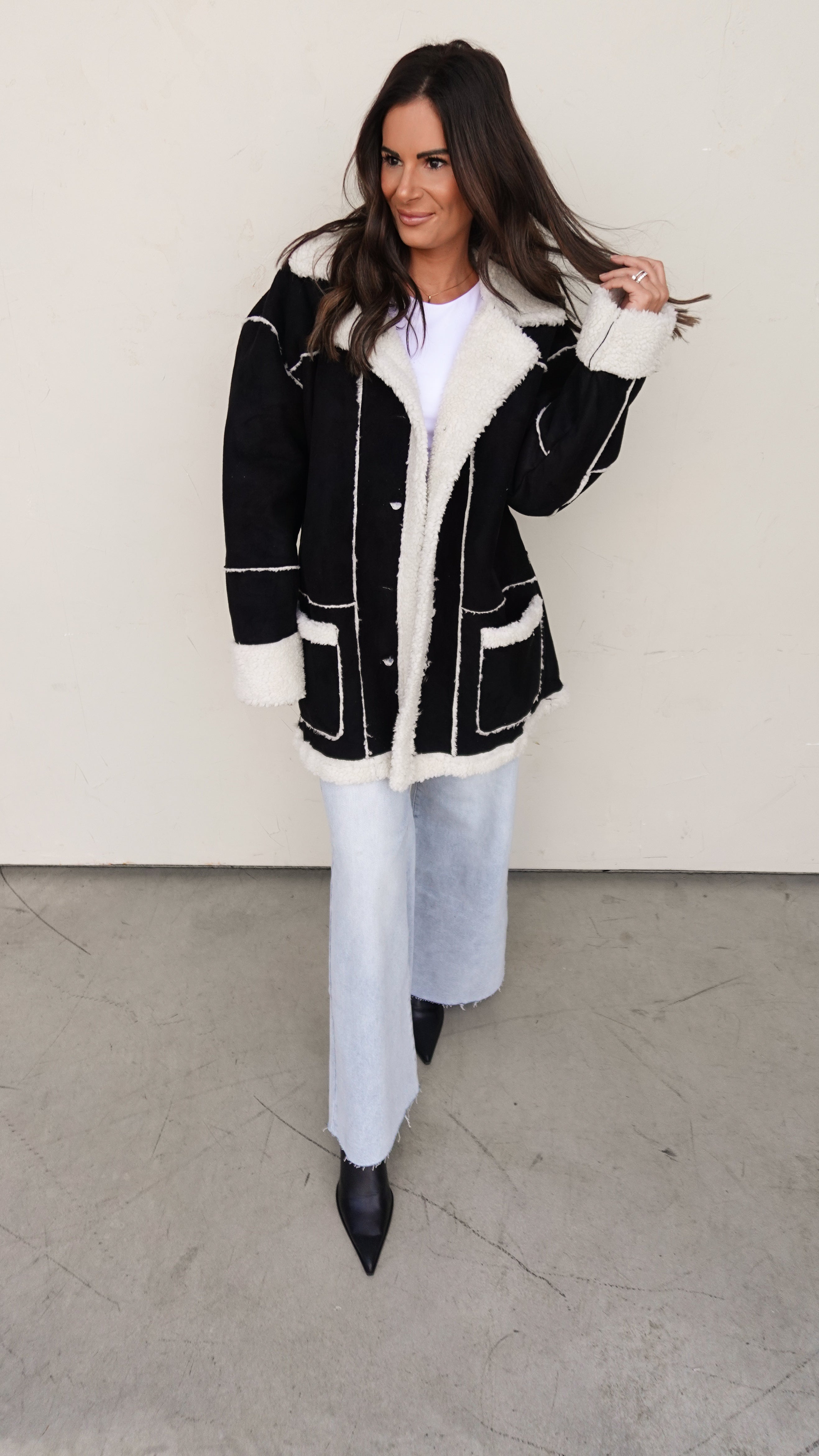 Sherpa-Lined Faux Suede Jacket - Black & Cream